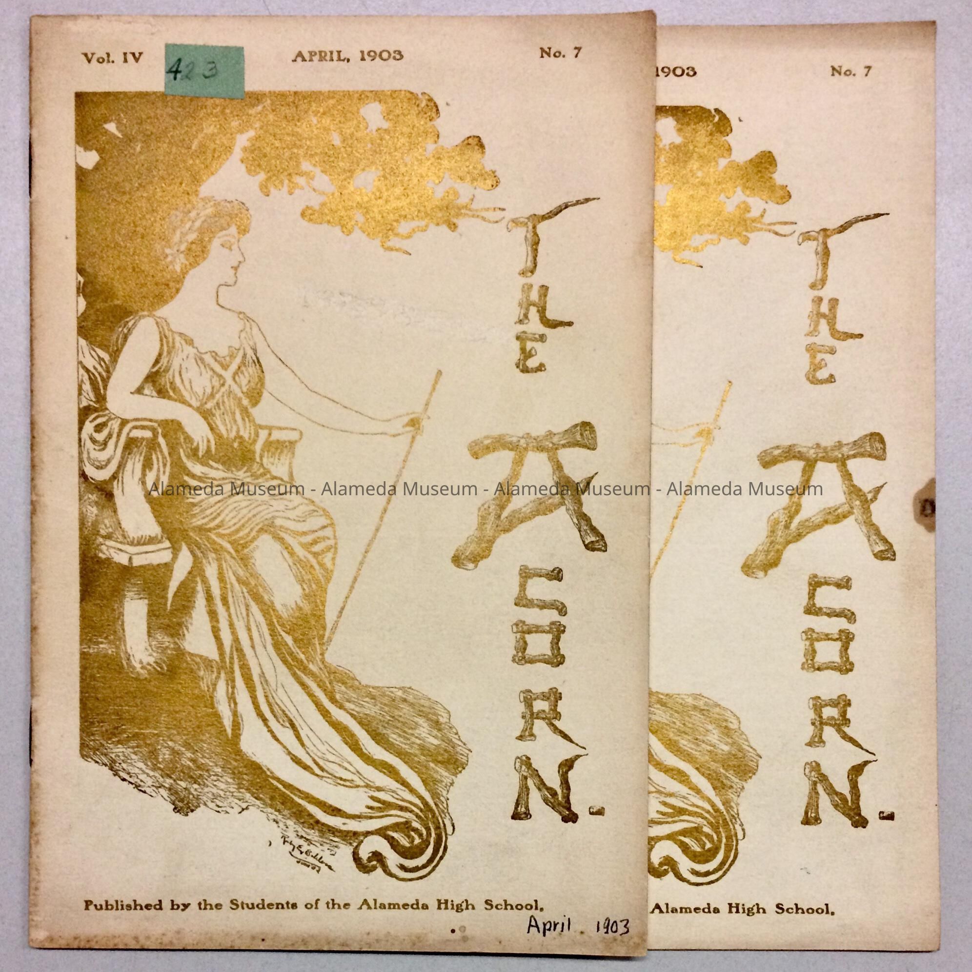 THE APRIL 1903 EDITION OF "THE ACORN," PUBLISHED BY STUDENTS OF THE ALAMEDA HIGH SCHOOL. PUBLICATION ALSO INCLUDES ADVERTISEMENTS FOR LOCAL BUSINESSES. "A" IS NUMBERED "423."