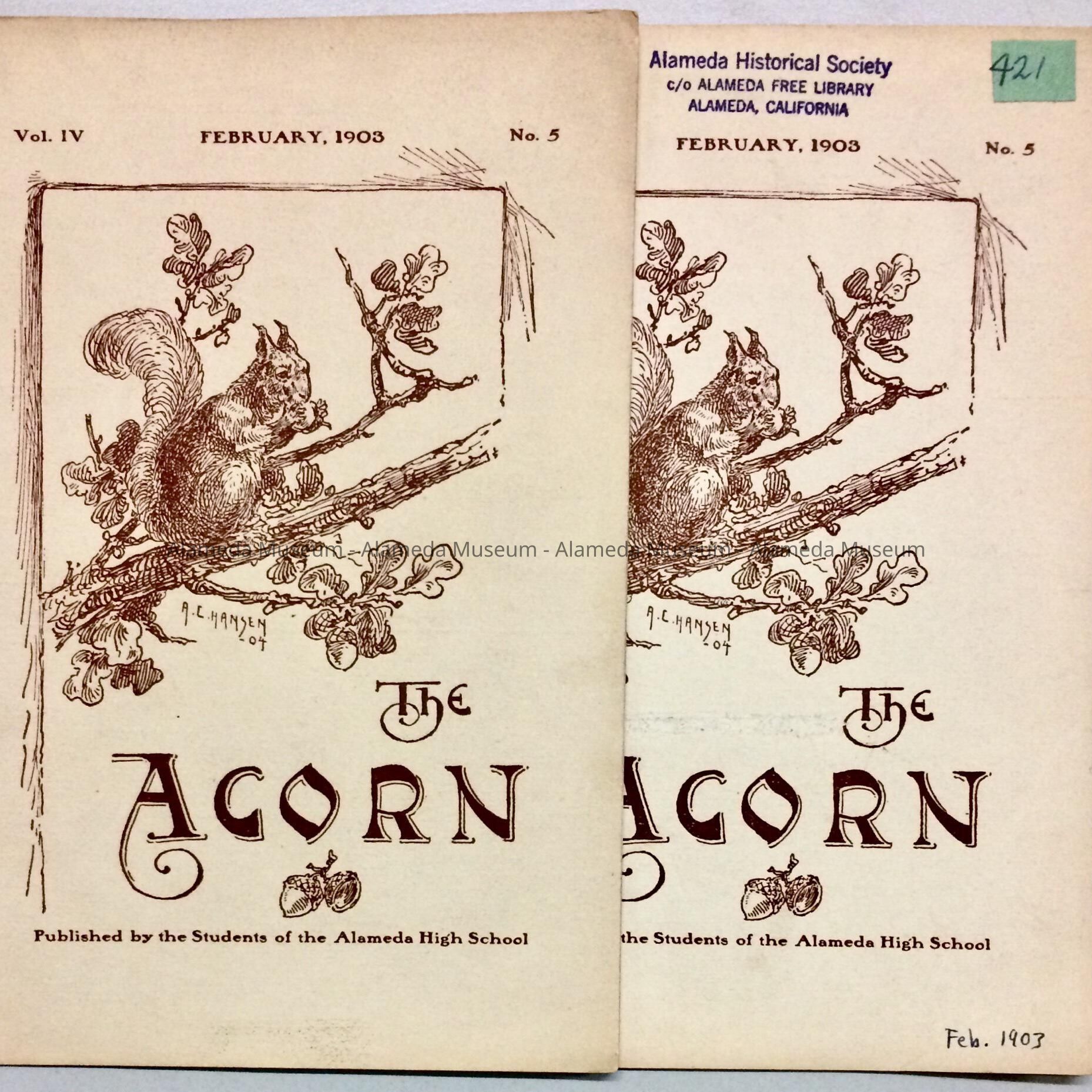 FEBRUARY 1903 EDITION OF "THE ACORN," PUBLISHED BY STUDENTS OF ALAMEDA HIGH SCHOOL. INCLUDED, ALSO, ARE ADVERTISEMENTS FOR LOCAL BUSINESSES. "B" IS NUMBERED 1421."