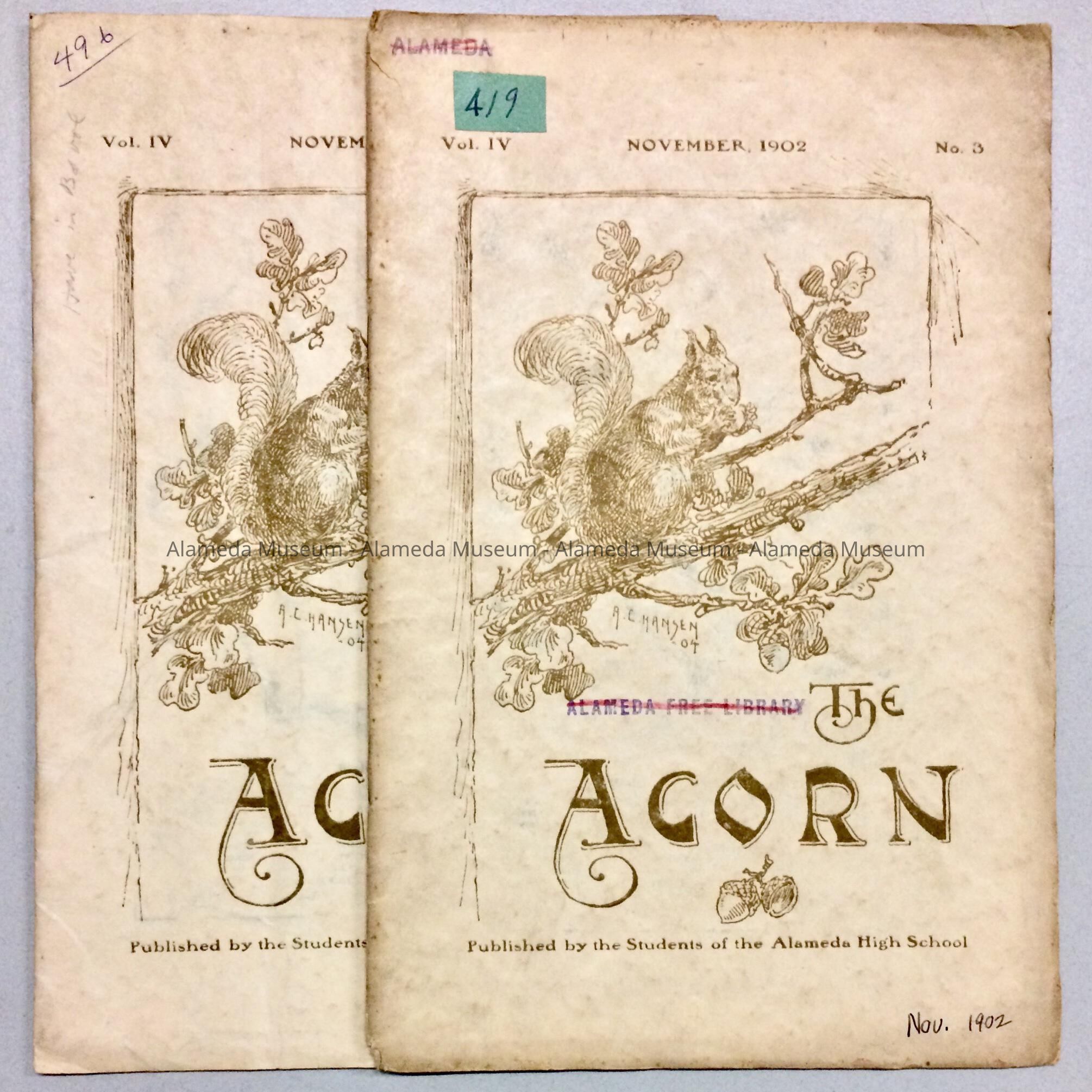 NOVEMBER 1902 EDITION OF "THE ACORN," PUBLISHED BY STUDENTS OF THE ALAMEDA HIGH SCHOOL. ALSO INCLUDED ARE ADVERTISEMENTS FOR LOCAL BUSINESSES. NUMBERED "419" AND "496."