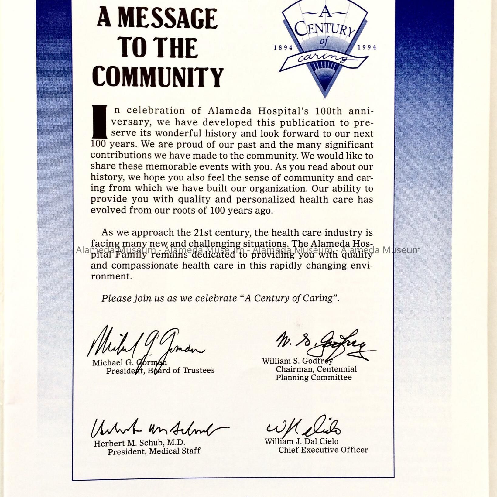 Copies of Alameda Hospital anniversary booklet 'A Century of Caring, 1894-1994'Entry/Object ID