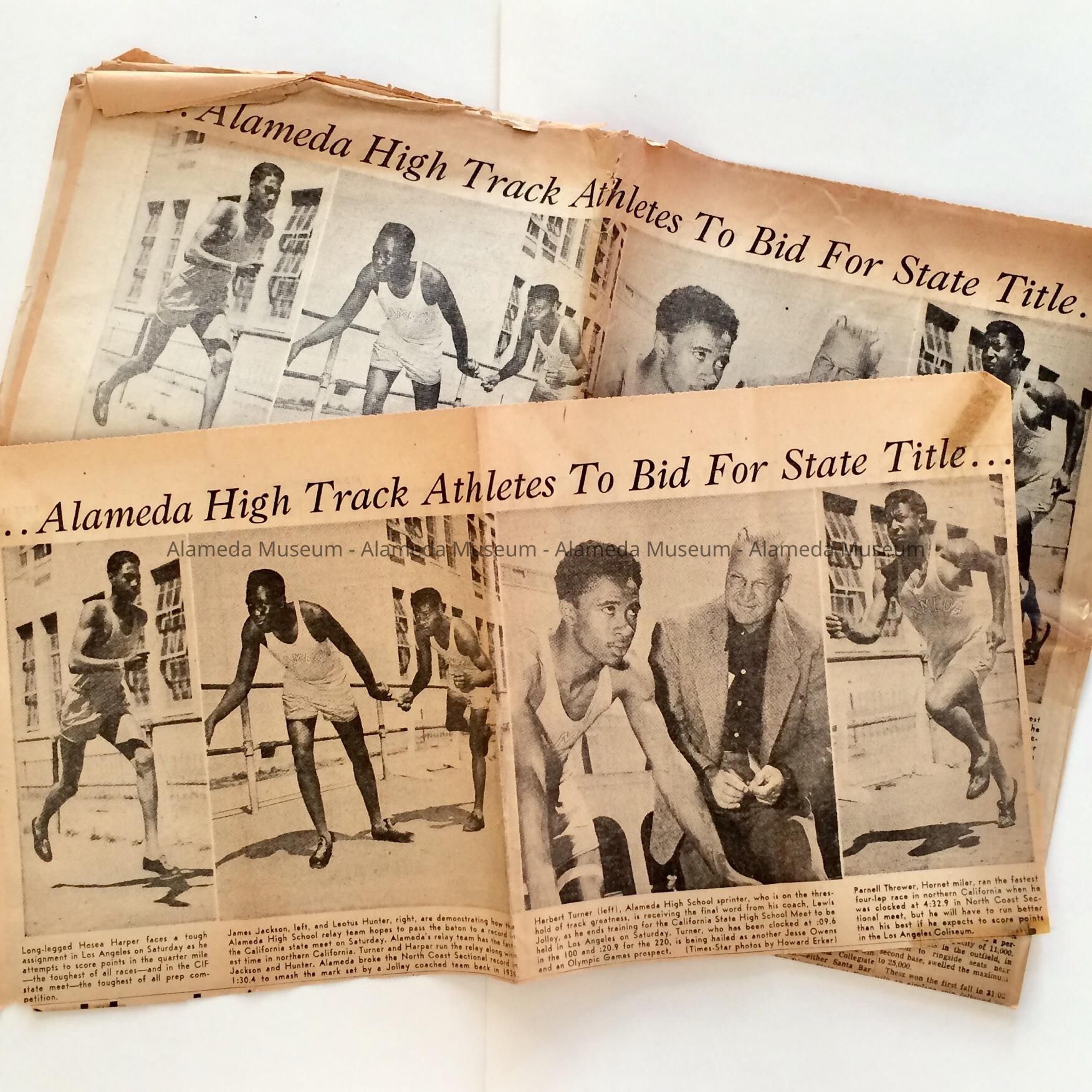 TWO COPIES OF AN ILLUSTRATED NEWSPAPER CLIPPING, WITH BOLD-PRINTED CAPTION, "ALAMEDA HIGH TRACK ATHLETES TO BID FOR STATE TITLE."