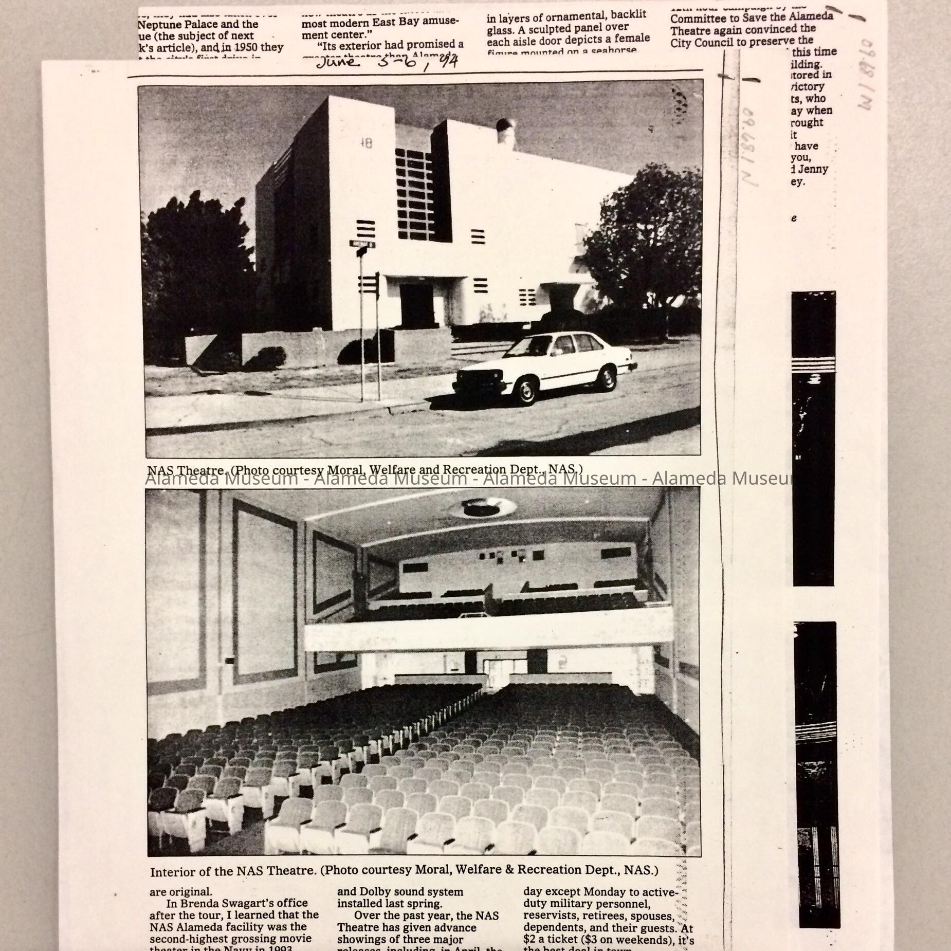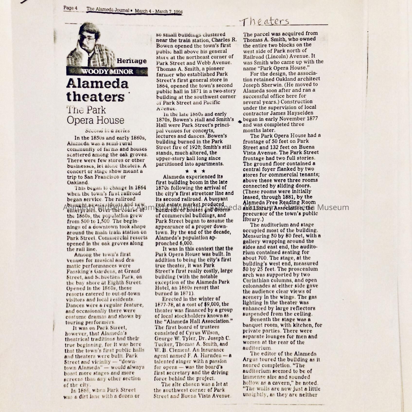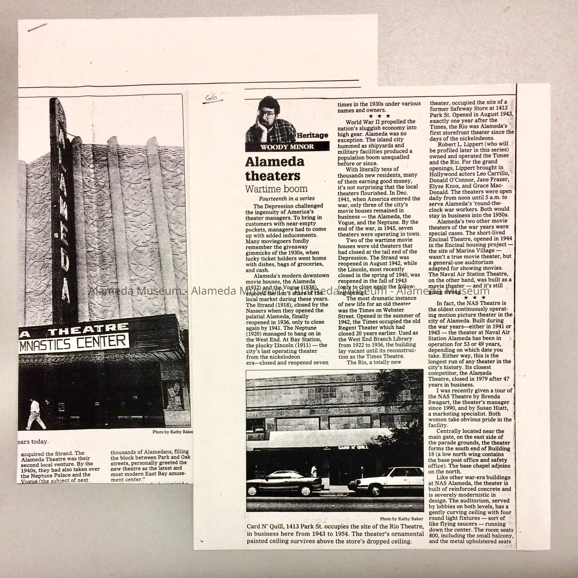 HISTORY OF OBJECT: COPIES OF WOODY MINOR'S HERITAGE ARTICLES THAT APPEARED IN THE ALAMEDA JOURNAL CONCERNING HISTORIES OF THE THEATRES IN ALAMEDA FROM THE NINETEENTH CENTURY TO THE PRESENT.
