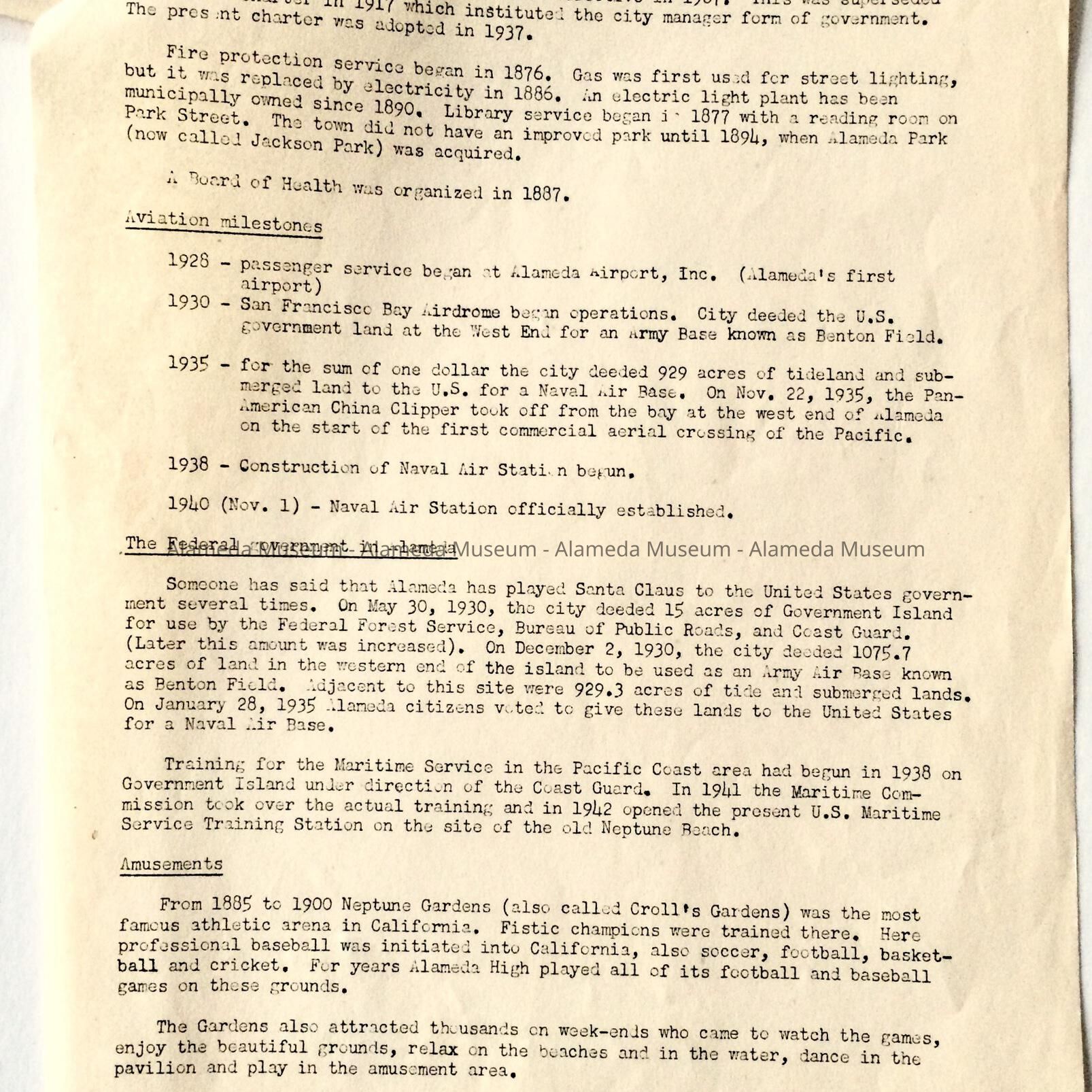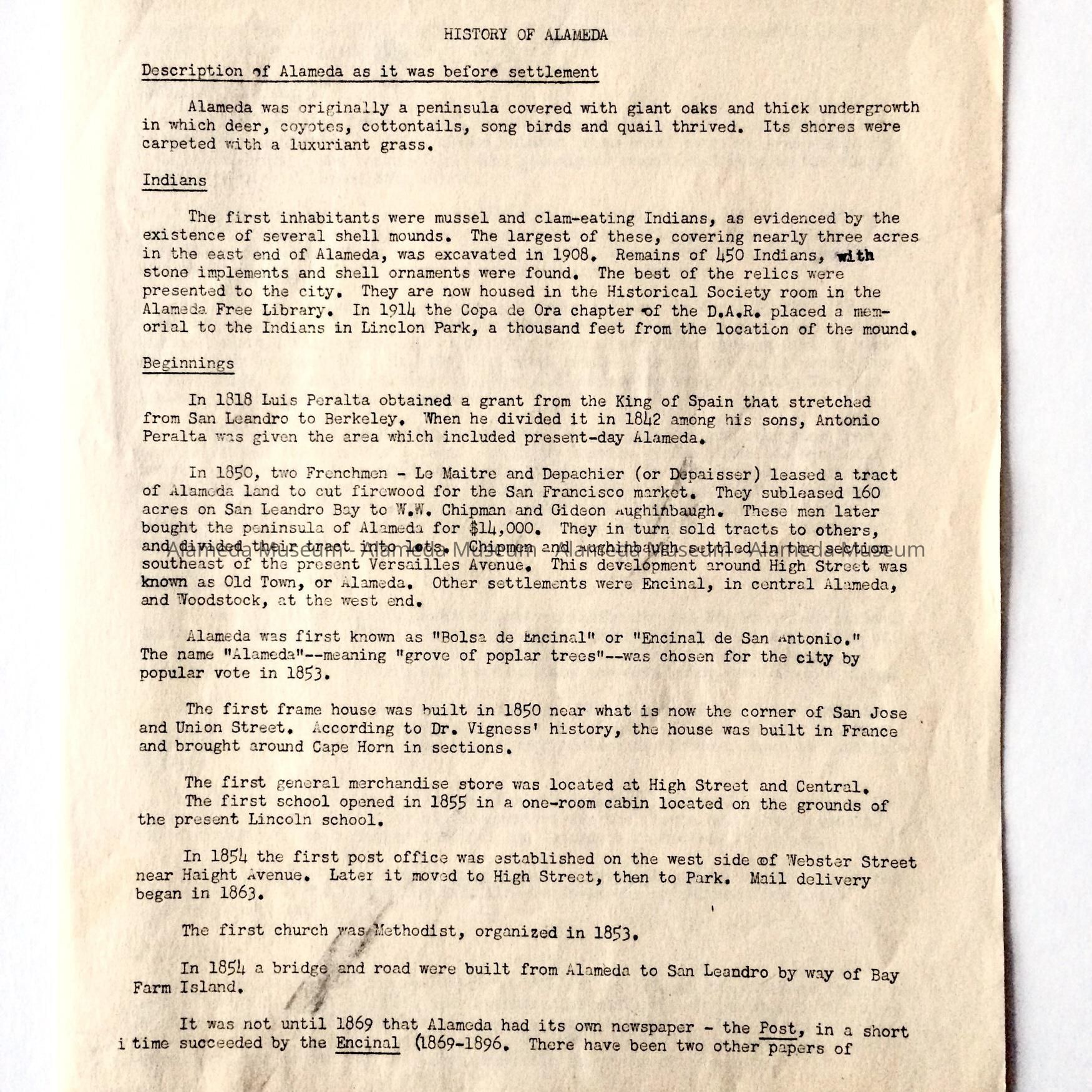 Three (3) page mimeographed copies with bold printed caption "History of Alameda".