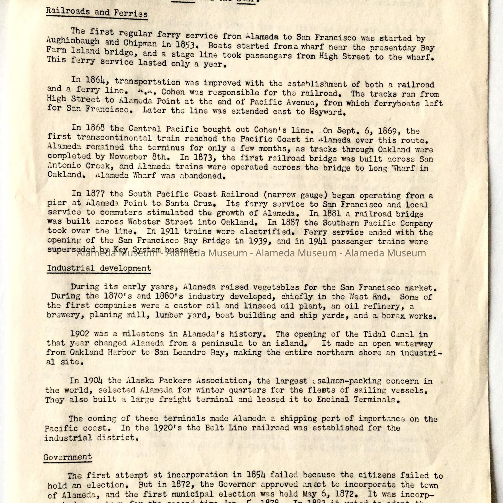 History: Short history of Alameda broken up into categories such as, Indians, Industrial Development, Government, etc. The author is unknown.