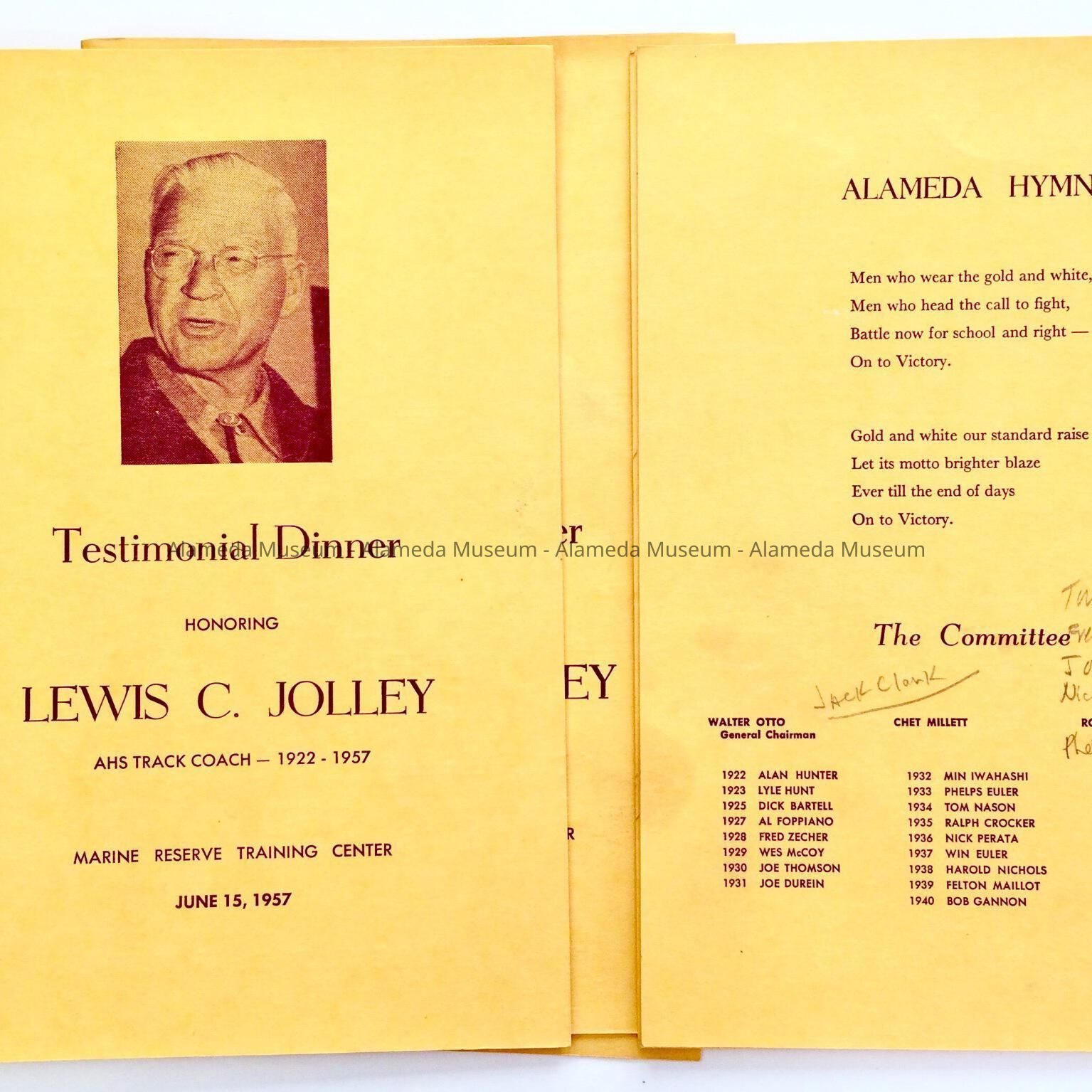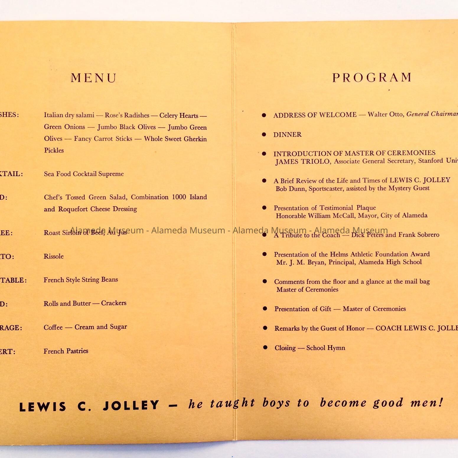 A PROGRAM ISSUED AT THE TESTIMONIAL DINNER HELD TO HONOR LEWIS C JOLLEY, ALAMEDA HIGH SCHOOL TRACK COACH (1922-1957). THE EVENT WAS HELD ON JUNE 15, 1957.
