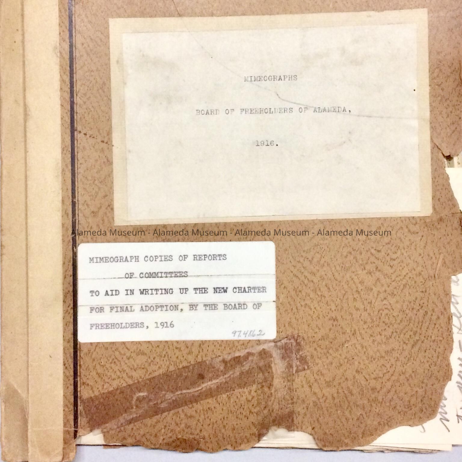 MIMEOGRAPHED COPIES OF REPORTS OF COMMITTEES TO AID IN WRITING THE NEW CHARTER FOR FINAL ADOPTION BY THE BOARD OF FREEHOLDERS IN 1916, PURSUANT TO CREATING THE CITY MANAGER FORM OF GOVERNMENT FOR ALAMEDA. BOOKLET WAS GIVEN TO THE ALAMEDA HISTORICAL SOCIETY PRIOR TO 1971, NUMBERED "8-X," AND HERETOFORE NOT OFFICIALLY CATALOGED.