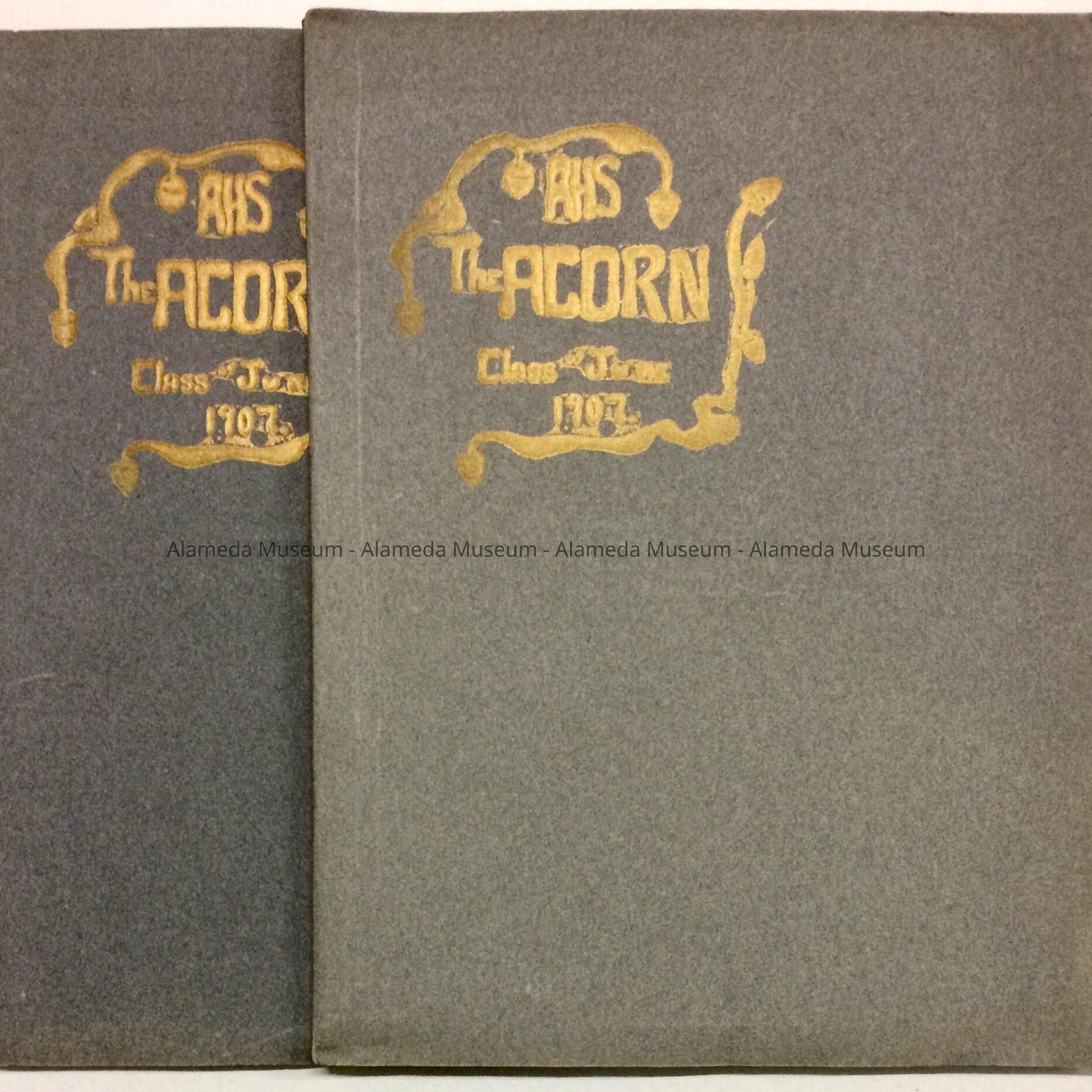 HISTORY OF OBJECT: THE JUNE 1907 EDITION OF THE ALAMEDA HIGH SCHOOL PUBLICATION TITLED, "THE ACORN." THE BOOK IS ILLUSTRATED WITH PORTRAITS OF THE GRADUATES, STUDENT-AUTHORED ARTICLES, AND ADVERTISEMENTS FOR LOCAL BUSINESSES.