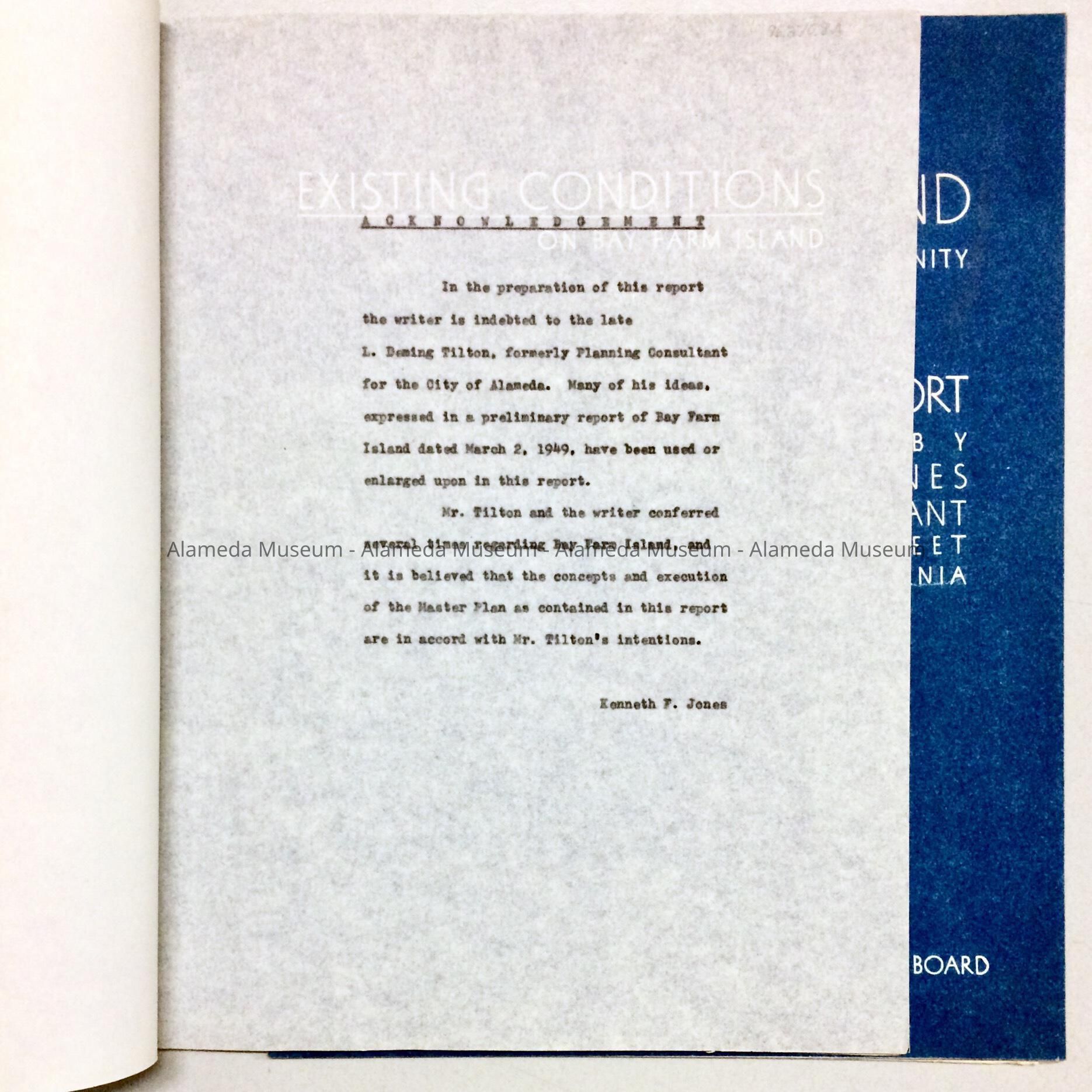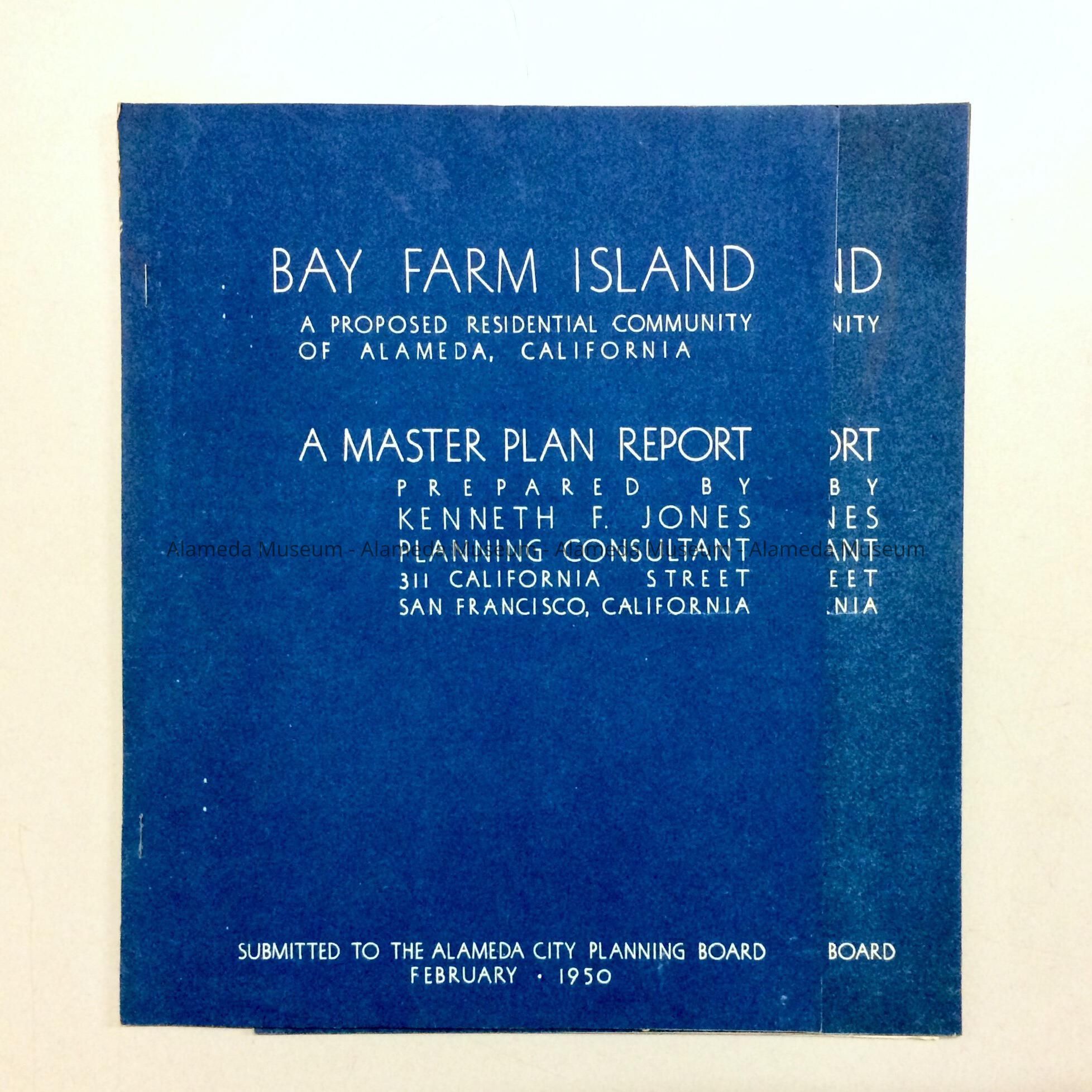 "BAY FARM ISLAND: A PROPOSED RESIDENTIAL COMMUNITY OF ALAMEDA." A MASTER PLAN REPORT PREPARED GY KENNETH F JONES, PLANNING CONSULTANT, SAN FRANCISCO; SUBMITTED TO THE ALAMEDA CITY PLANNING BOARD, FEBRUARY 1950.