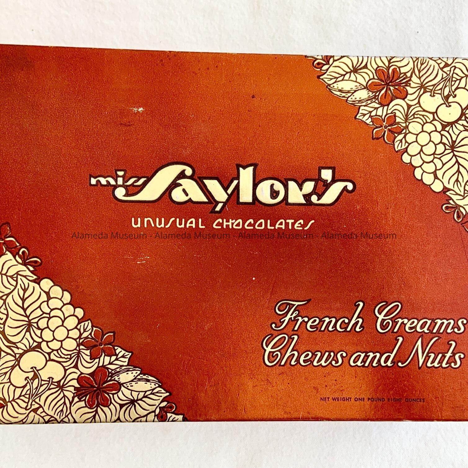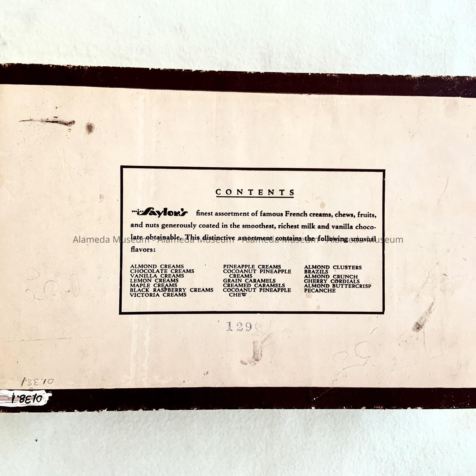 A BOX THAT FORMERLY HOUSED CHOCOLATES MADE BY SAYLOR'S ON PARK STREET, ALAMEDA, CALIFORNIA.