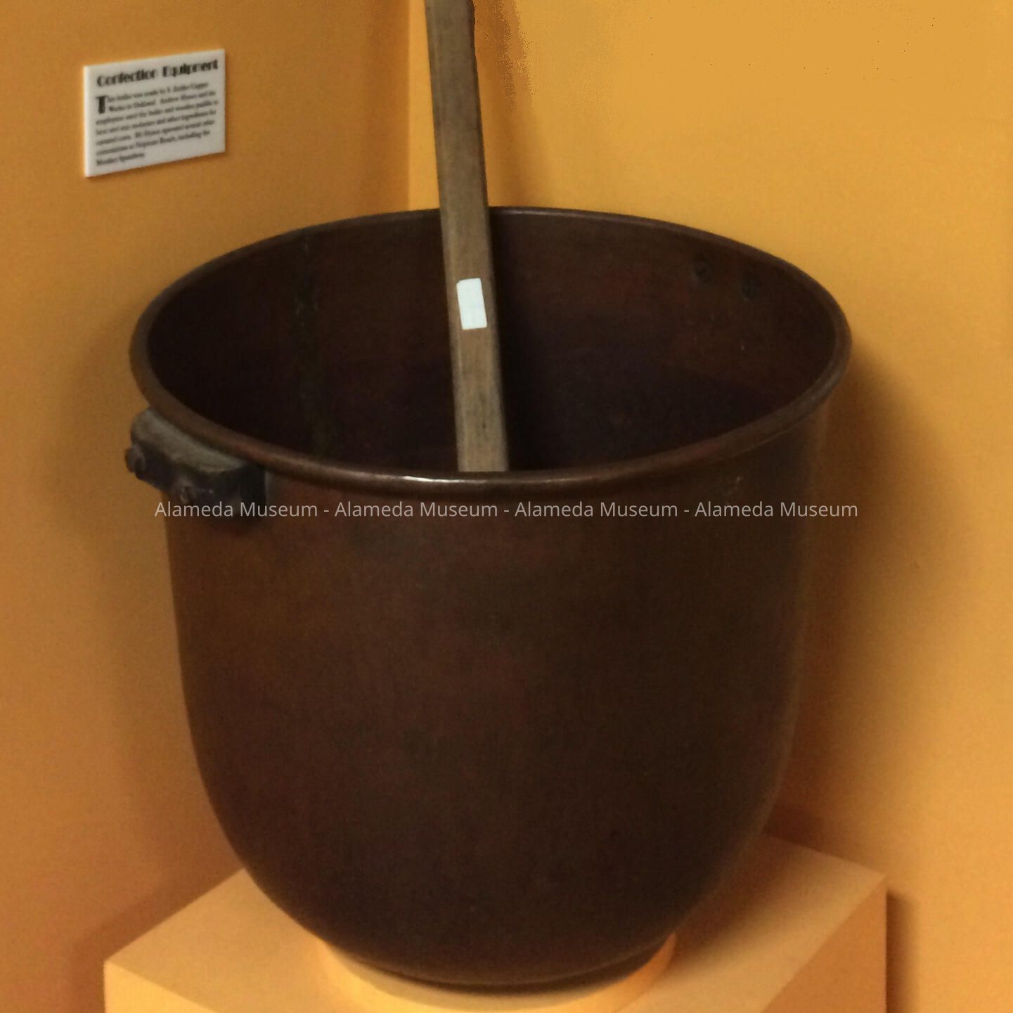 LARGE COPPER BOILER AND WOODEN PADDLE USED BY ANDREW HYNES AND CO-WORKERS TO HEAT MOLASSES AND OTHER INGREDIENTS DURING PREPARATION OF CARMEL CORN AT NEPTUNE BEACH, CALIFORNIA. MR HYNES OPERATED SEVERAL CONCESSIONS AT NEPTUNE BEACH. THE BOILER AND PADDLE WERE PRESENTED TO THE DONOR BY MR HYNES, WHO EMPLOYED GEORGE FILIPELLI FOR MANY YEARS.