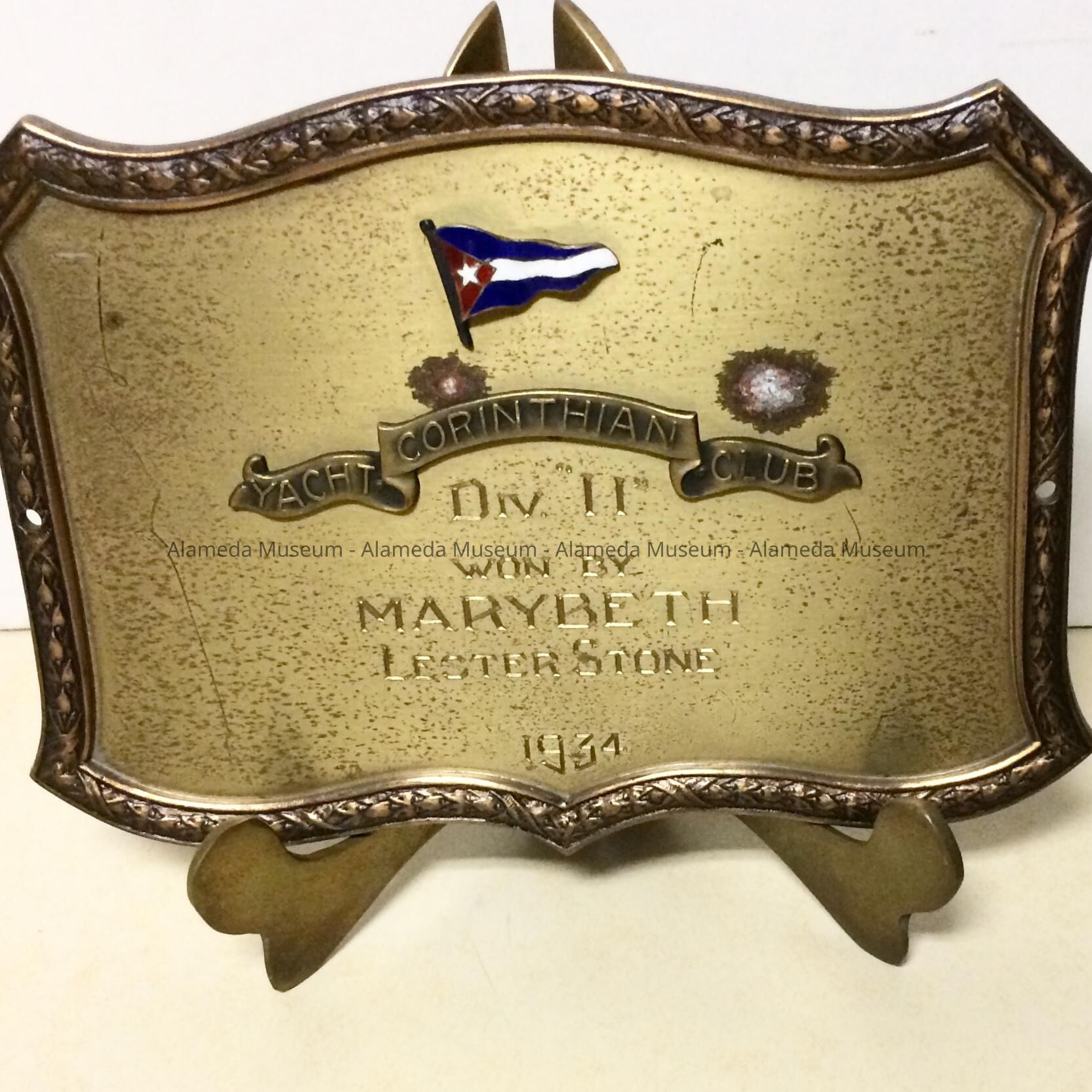 Description; A metal (copper) plaque with an ornamental floral border, on the face of which are appended a red/white/blue pennant, and the inscription: "Corinthian Yacht Club. Engraved below is: "Div 11 Won by MaryBeth Lester Stone 1934".