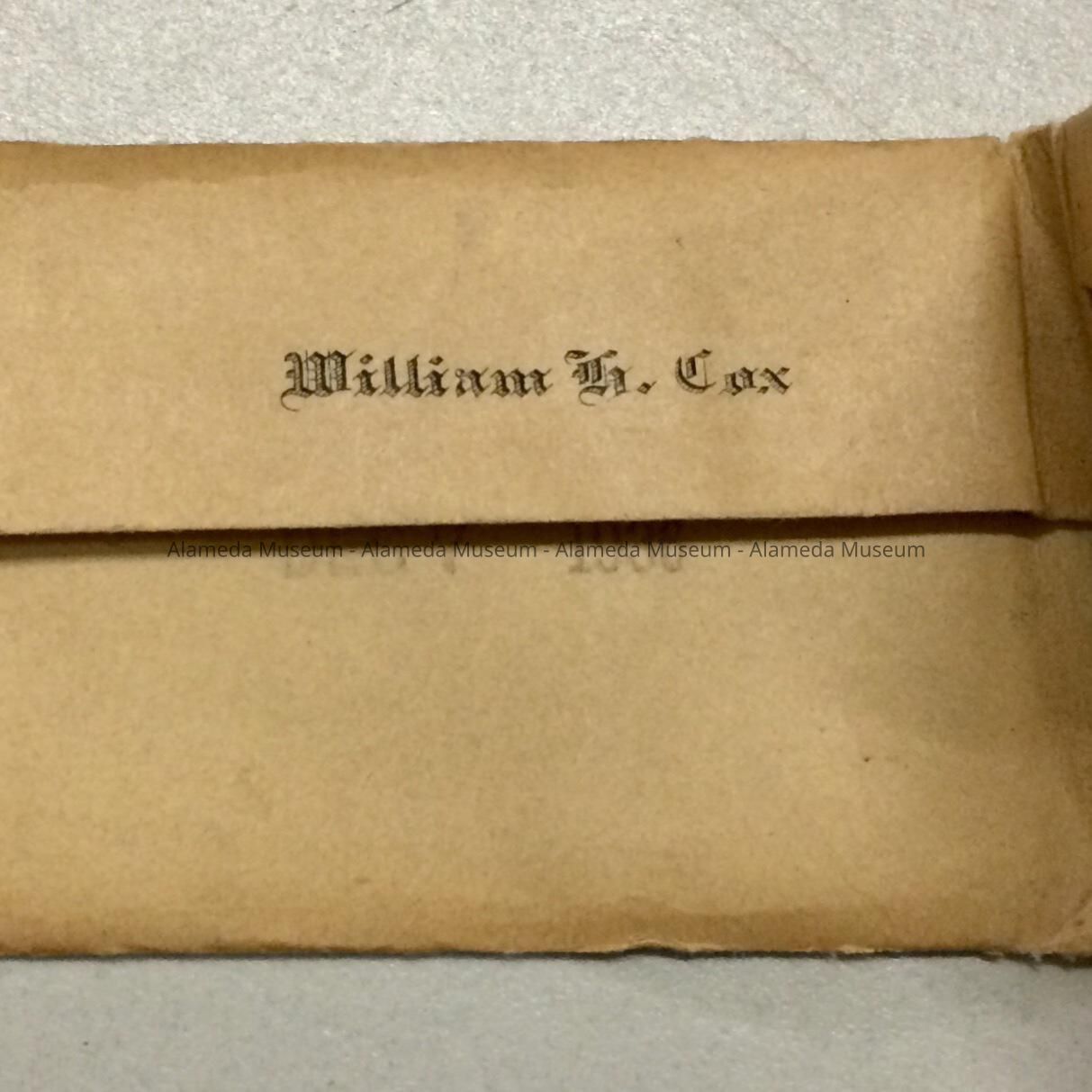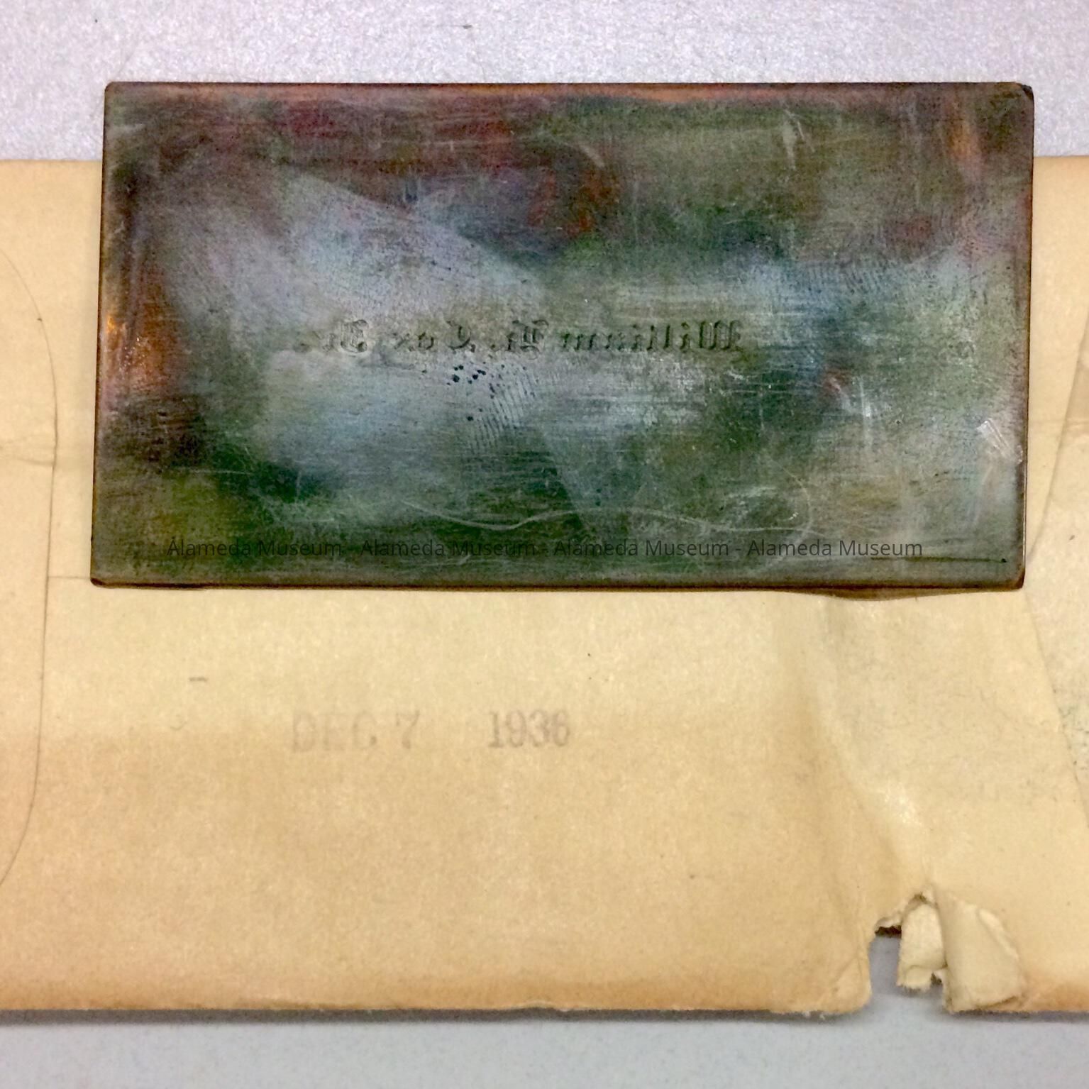 Printer's plate and sample of the calling cards (2002.61.2) of William H. Cox. Longtime resident of Alameda. Husband of Adeline T. Cox.