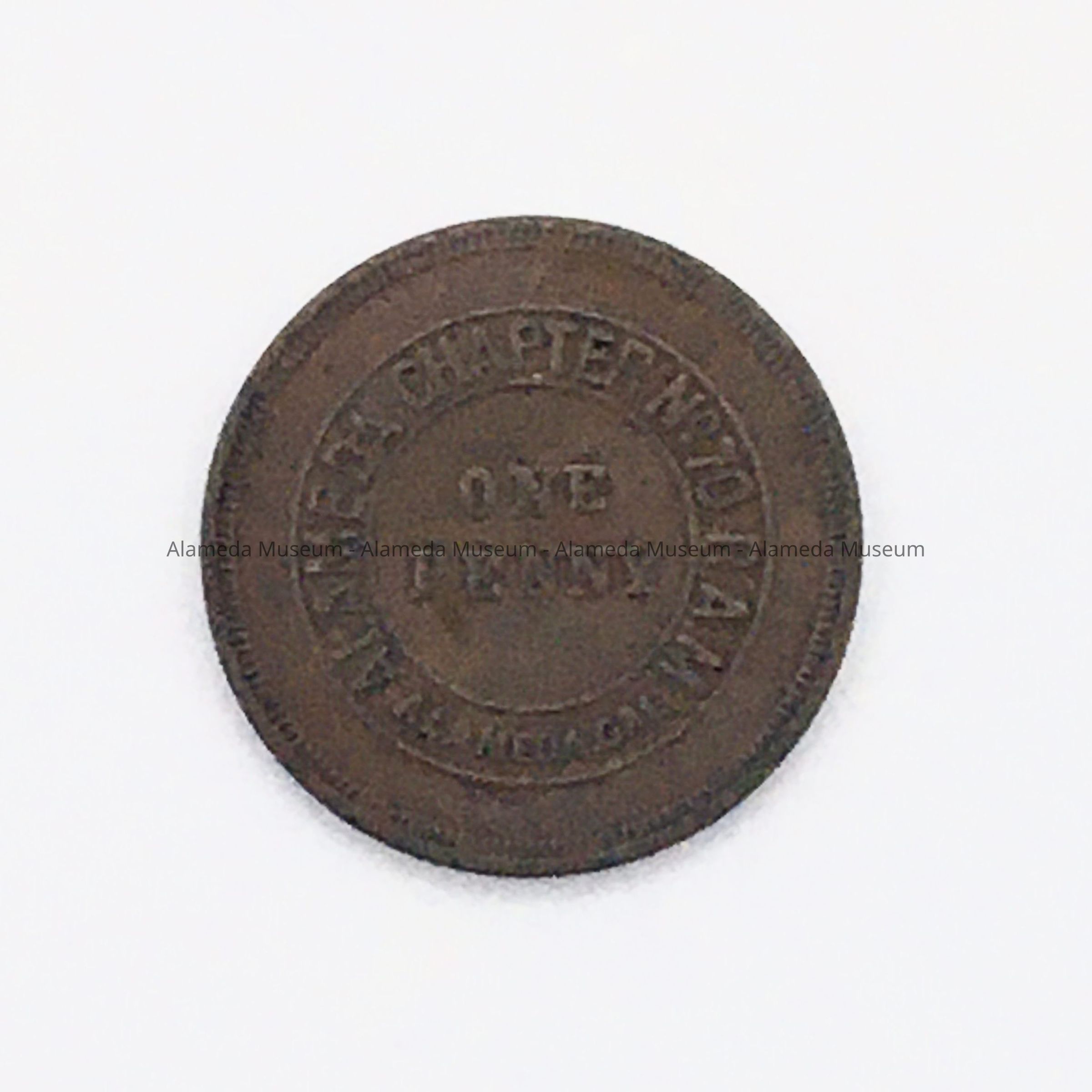 HISTORY OF OBJECT: A TOKEN OR COIN, WORTH ONE CENT, ISSUED BY THE ALAMEDA BRANCH OF THE MASONIC LODGE.