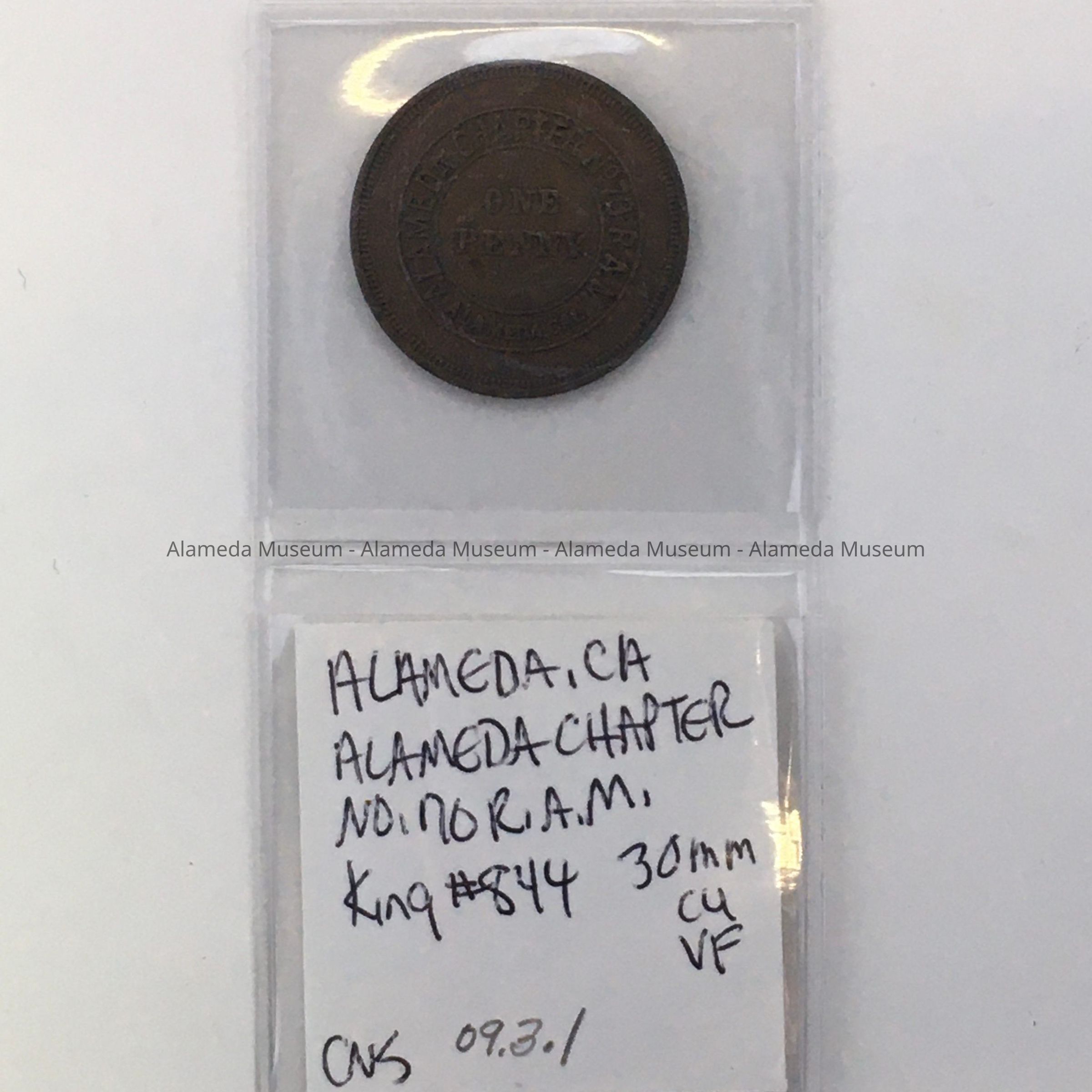 DESCRIPTION: A CIRCULAR-SHAPED COPPER COIN, OR TOKEN, IMPRESSED WITH THE WORDING, "ALAMEDA CHAPTER NO. 70, RAM, ALAMEDA, CAL." ONE PENNY.