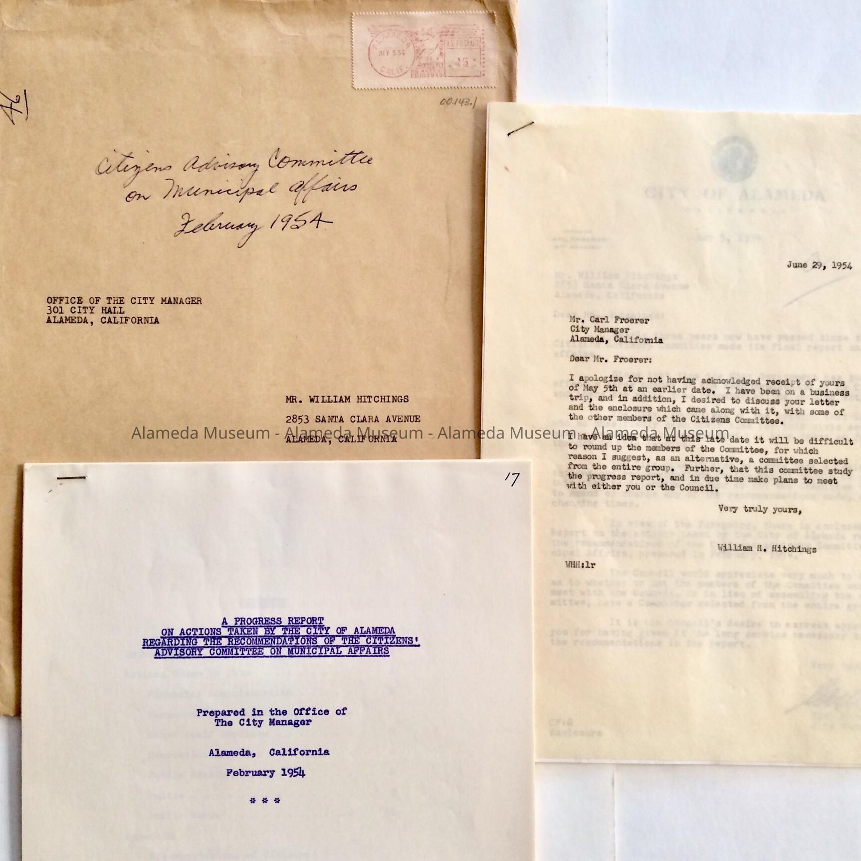 History: Report titled, "A Progress Report on Actions Taken by the City of Alameda Regarding the Recommendations of the Citizens Advisory Committee on Municipal Affairs," dated February 1954. The report is accompanied by letters addressed to Carl Froerer, City Manager, concerning the same. Given prior to 1971 #46 and never catalogued.