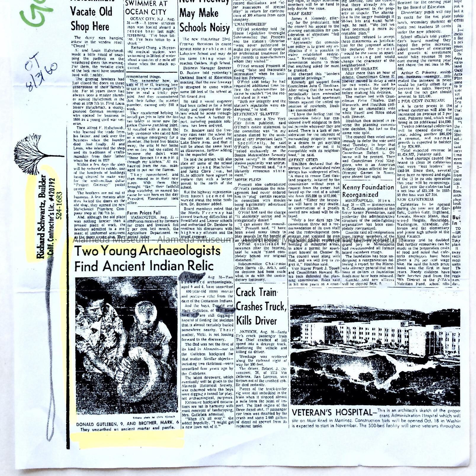 A COPY OF A NEWSPAPER ARTICLE, ENTITLED "TWO YOUNG ARCHAEOLOGISTS FIND ANCIENT INDIAN RELIC." THE ARTICLE STATES THAT DONALD GUTLEBEN (9) AND BROTHER MARK (6) FOUND AN INDIAN MORTAR AND PESTLE WHICH WERE SOME 600 YEARS OLD. THE BROTHERS RESIDED AT 1917 STANFORD STREET IN ALAMEDA.