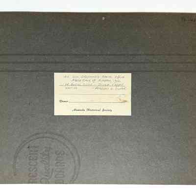 Description: Black/white photocopy of a vintage image. Photographer unknown. Mounted on black paperboard. Nail holes in several places along edge of the mounting, plus an old cataloging label is glued near the upper right corner. Description is written by hand in black ink onto the image near the upper midsection.