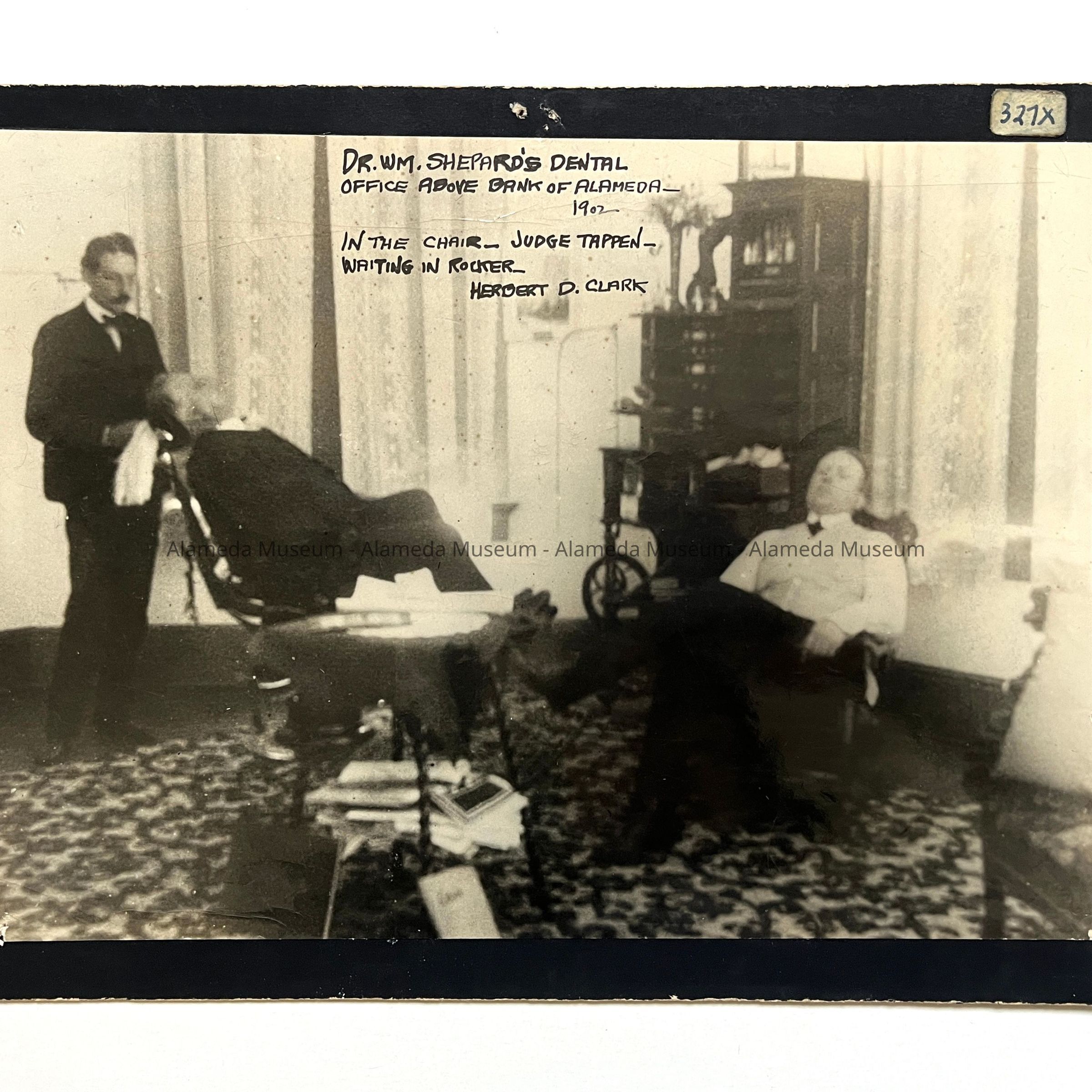 History of Object: Dr. Wm. Shepard's dental office scene showing Judge Robert Tappan in the patient's chair, and Herbert D. Clark, an insurance agent, seated in a waiting chair.
