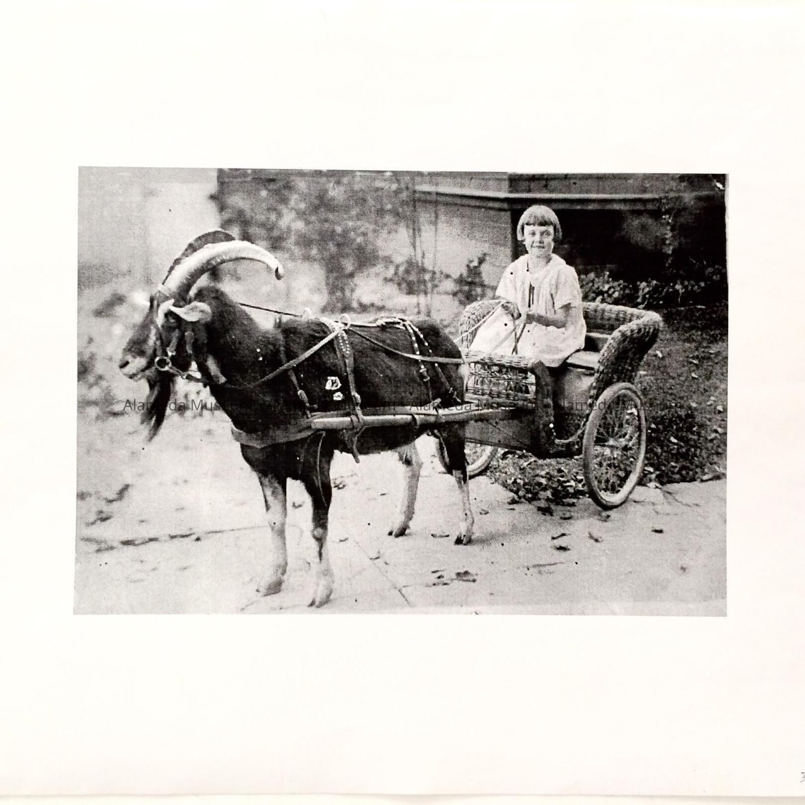 History of object: Reproduction of Eggers de Maria sitting in a carriage drawn by a goat. Donor states the man went with the goat around Alameda and took photos for ¢10 each.