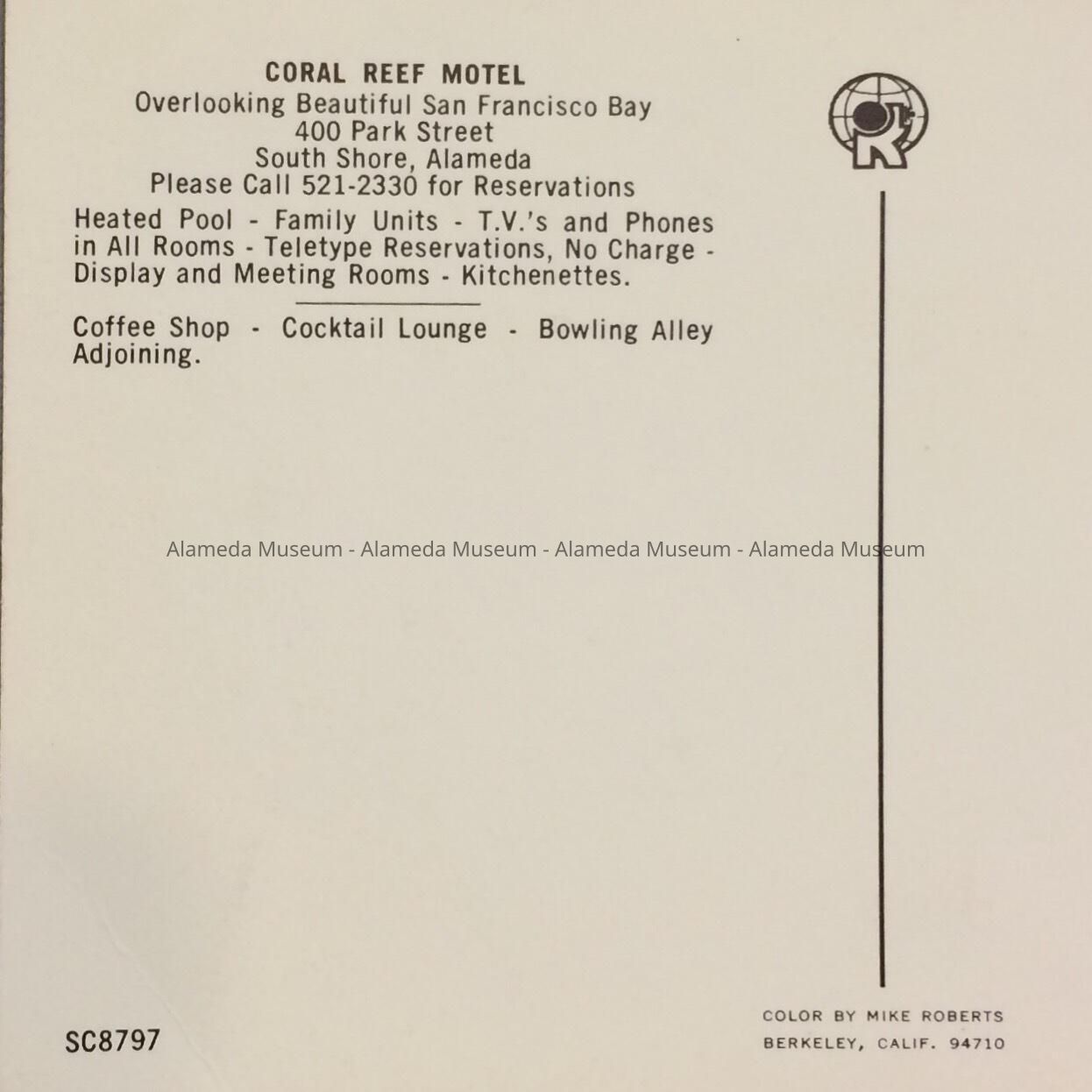 Postcard depicting the Coral Reef Motel, Park Street, South Shore, Alameda.