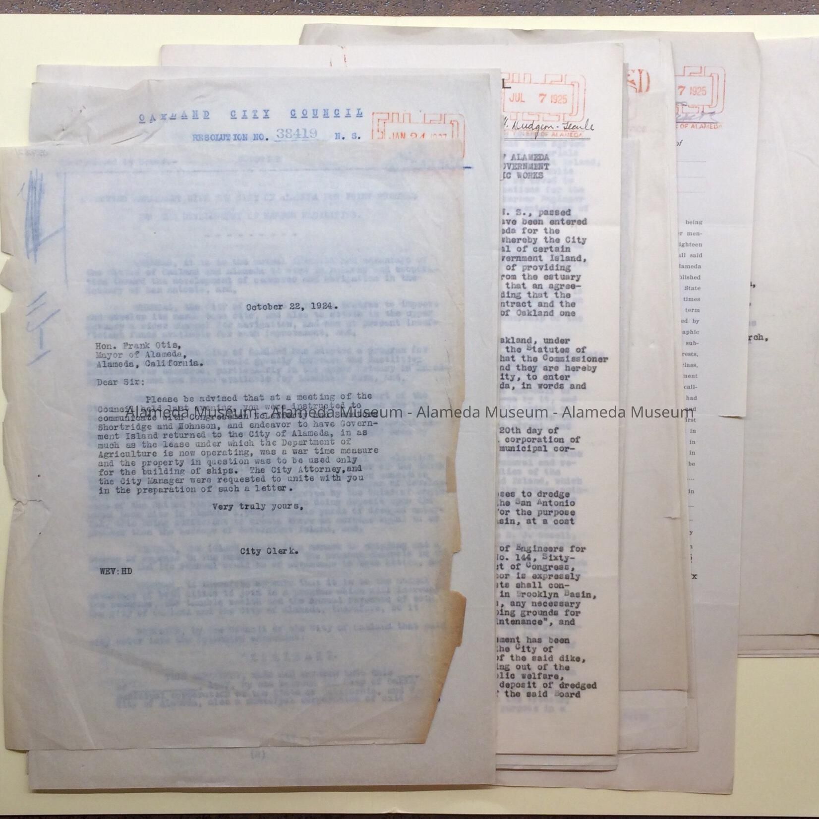 Correspondence about Government Island shores, 1925-1926Entry/Object ID