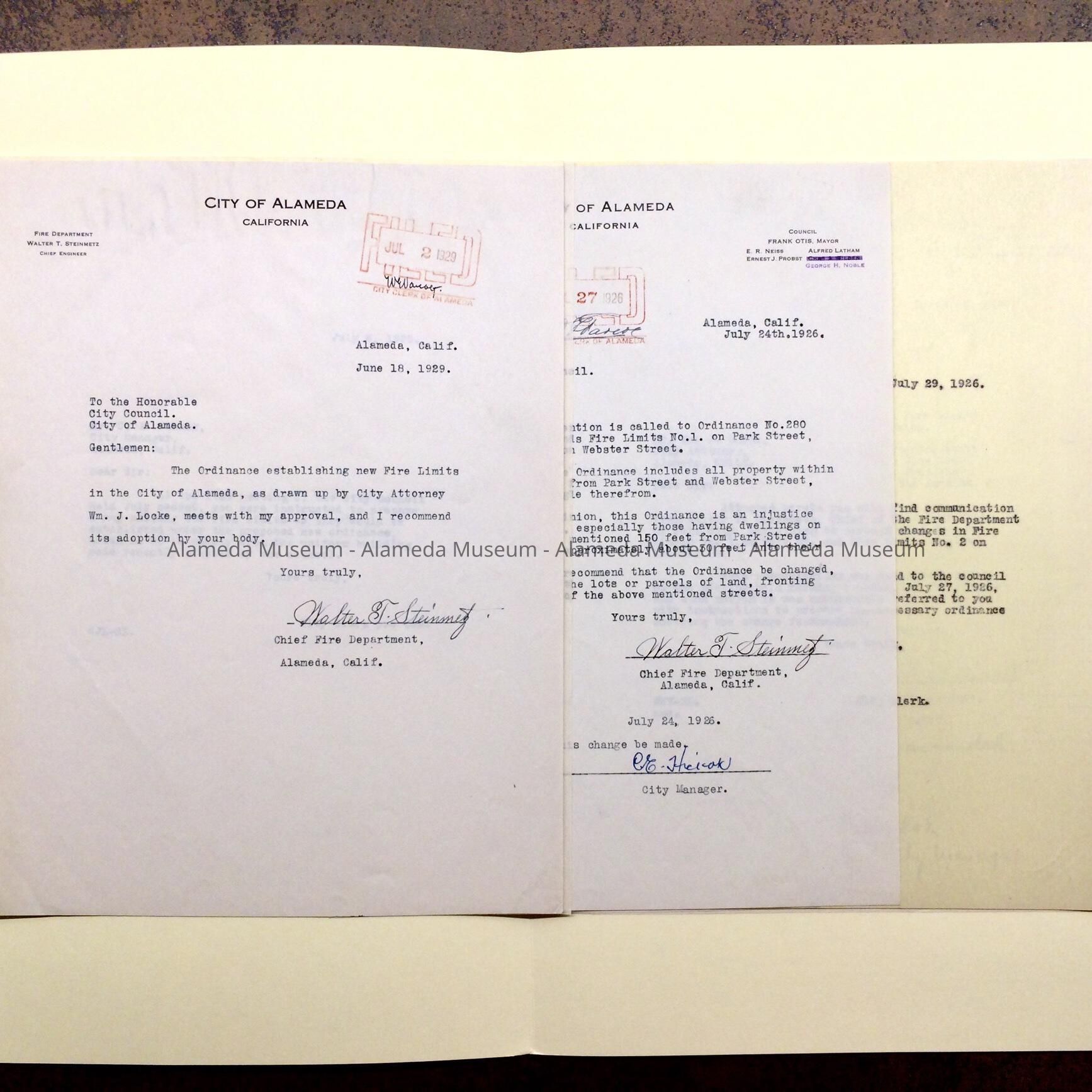 CORRESPONDENCE ESTABLISHING NEW FIRE ORDINANCES IN THE CITY OF ALAMEDA, AS DRAWN UP BY WILLIAM J LOCK, CITY ATTORNEY.
