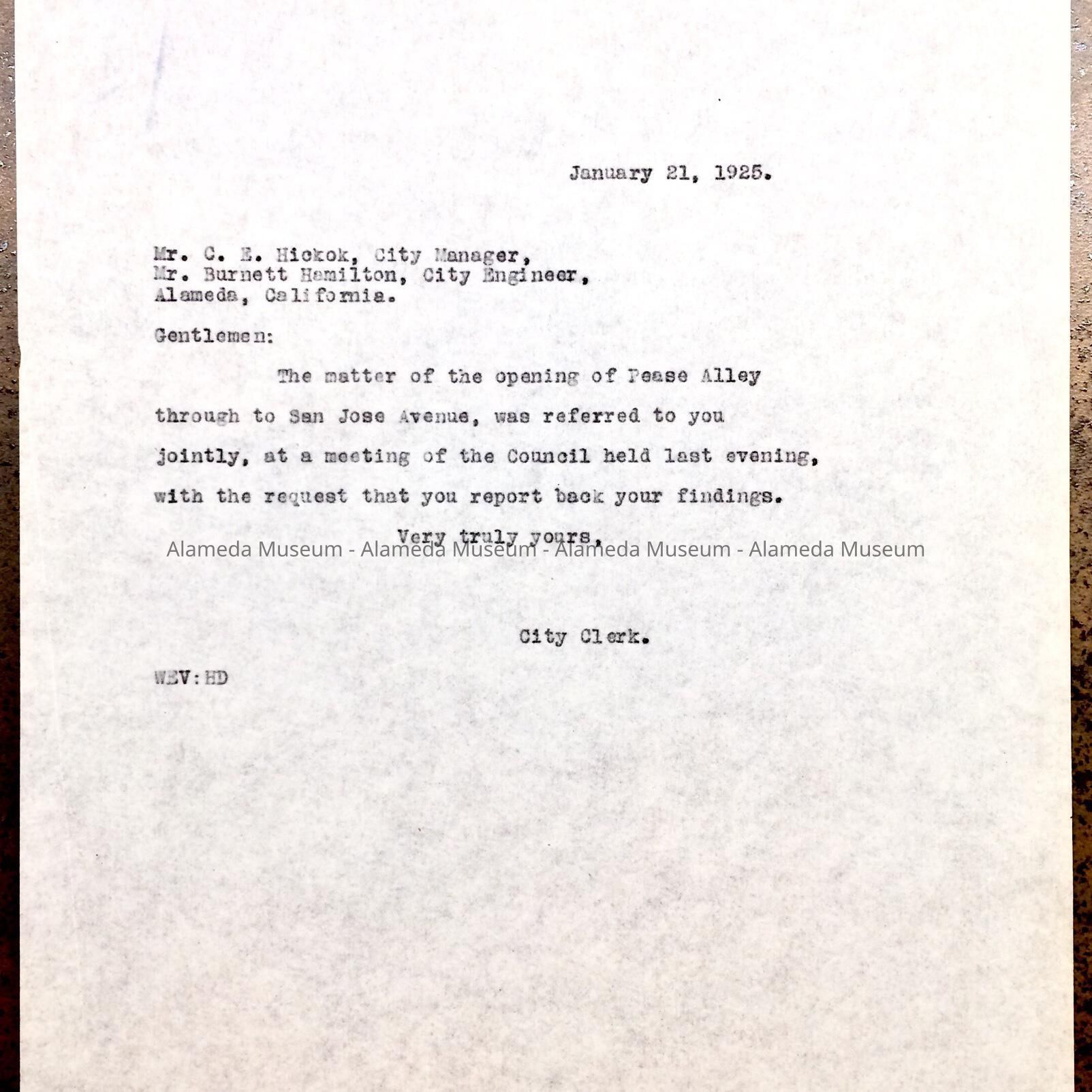 Correspondence about opening of Peace Alley through to San Jose, 1925Entry/Object ID