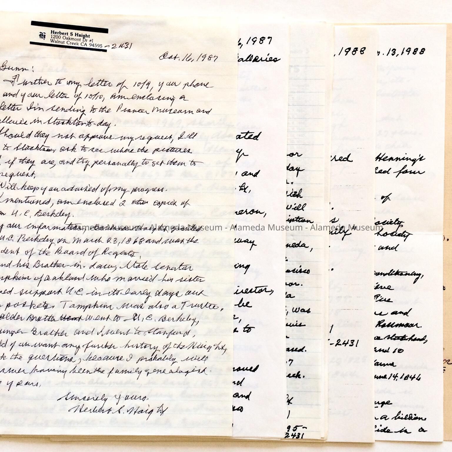 Correspondence from Herbert S. Haight, Grandson Henry H. Haight, former Governor of California and resident of Alameda. Some of the correspondence concerns the 2 framed photographic portraits of Mr. and Mrs. Henry H. Haight that Herbert S. Haight donated to the Alameda Historical Museum.