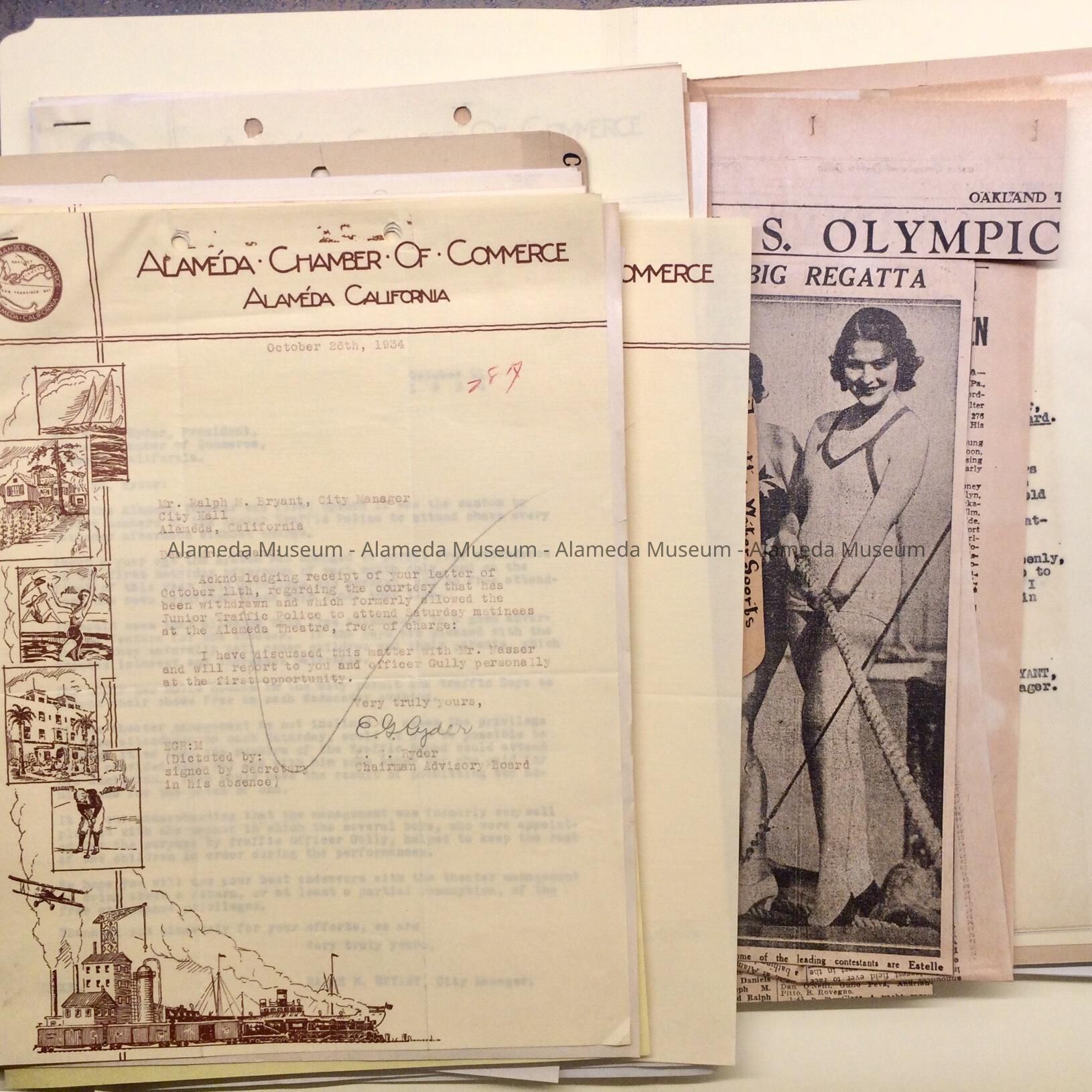 History of Object: Folder with correspondence between City Manager Ralph Bryant in 1934 relating to the activities of the Alameda Chamber of Commerce, including the staging of a Regatta, beauty contest, and water sports carnival; the results of a 1933 California State Retail Sales Census. Shows that in 1934, George Sperbeck was City Engineer. Includes a copy of a letter with Alameda County / City brochure sent to new citizens (December 1933).