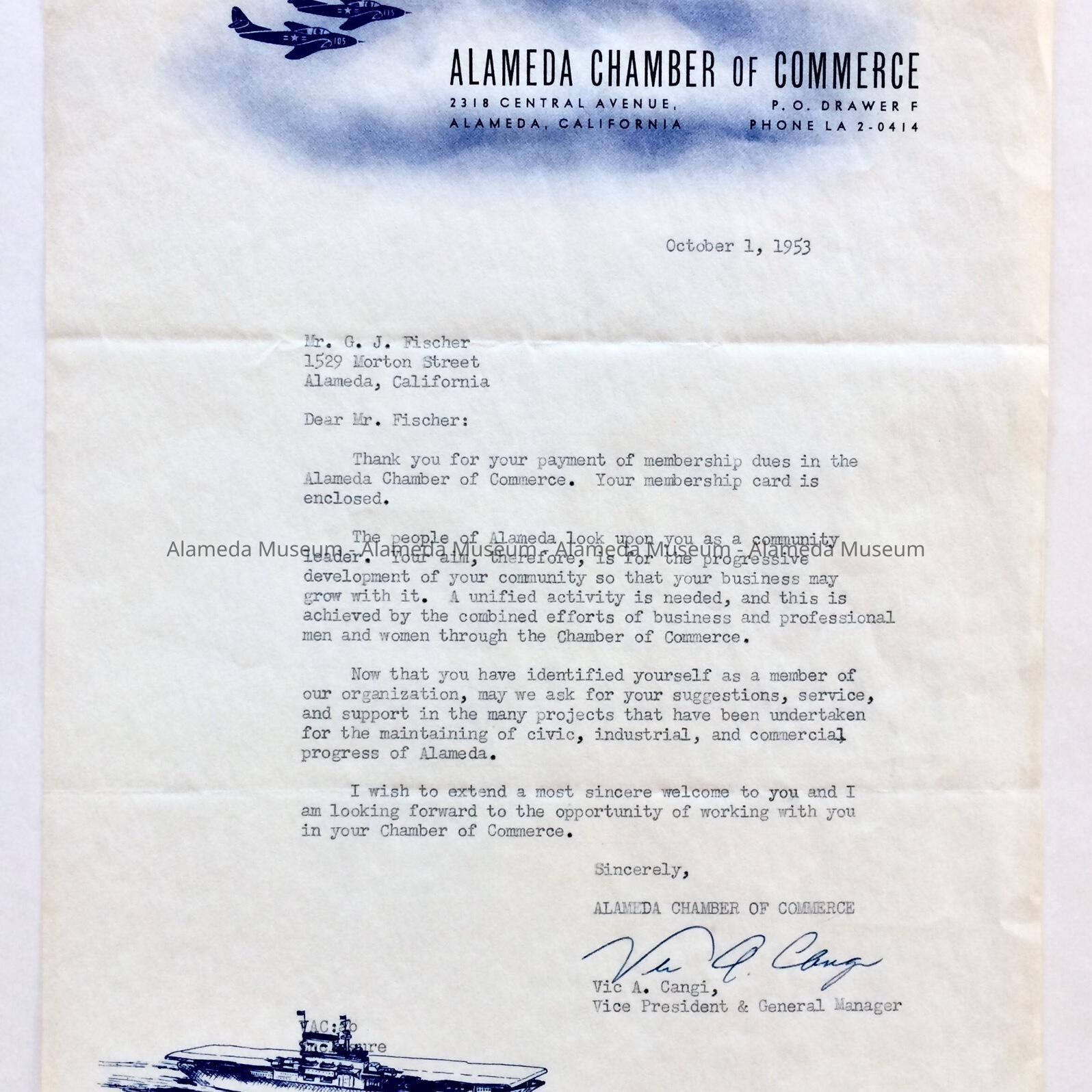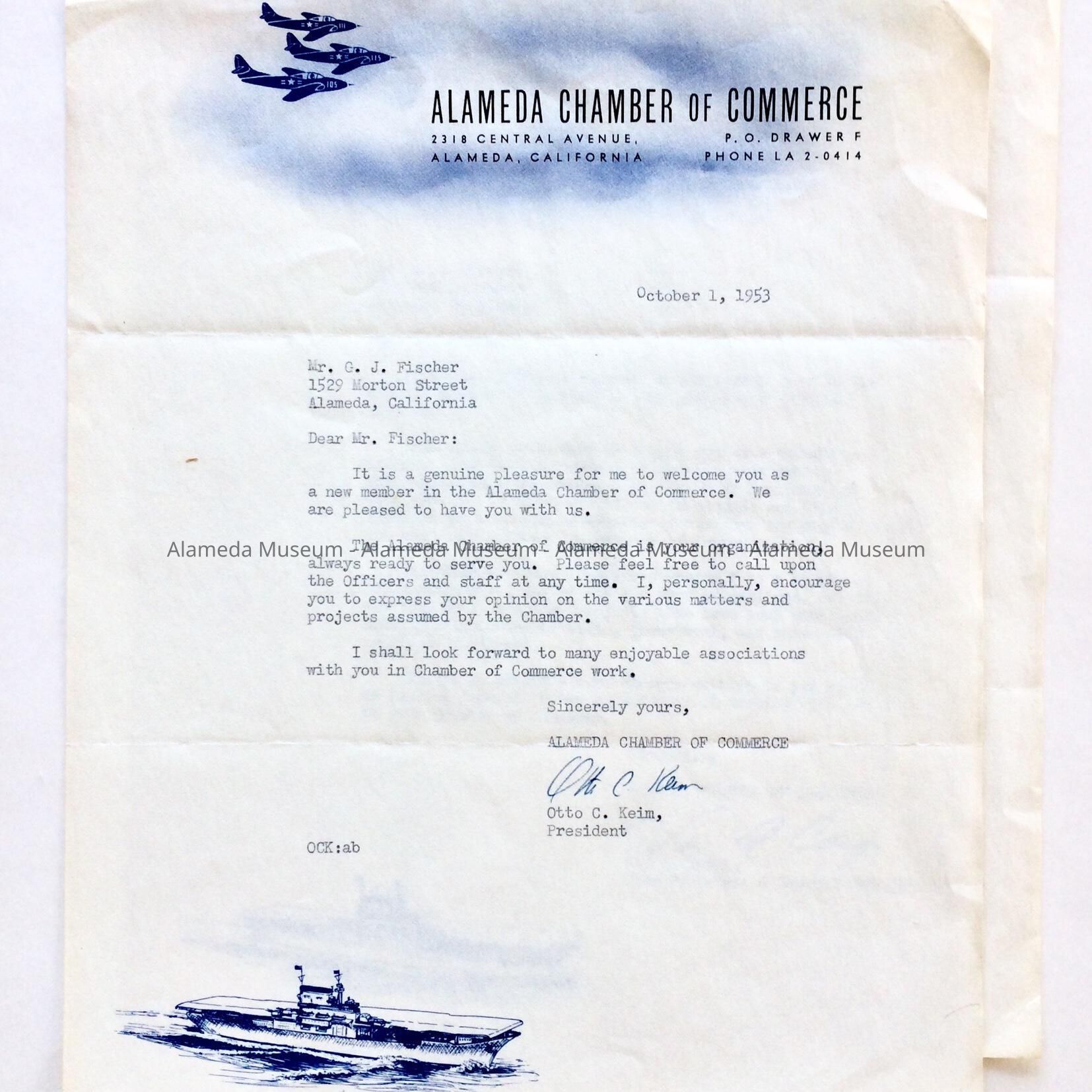 TWO LETTERS FROM THE ALAMEDA CHAMBER OF COMMERCE. 2318 CENTRAL AVENUE, ALAMEDA, DATED OCTOBER 1, 1953. ADDRESSED TO G J FISCHER, 1529 MORTON STREET, ALAMEDA. LETTERS EXPRESS GRATITUDE TO MR FISCHER FOR HAVING JOINED THE ALAMEDA CHAMBER OF COMMERCE, AND FOR HAVING PAID MEMBERSHIP DUES.