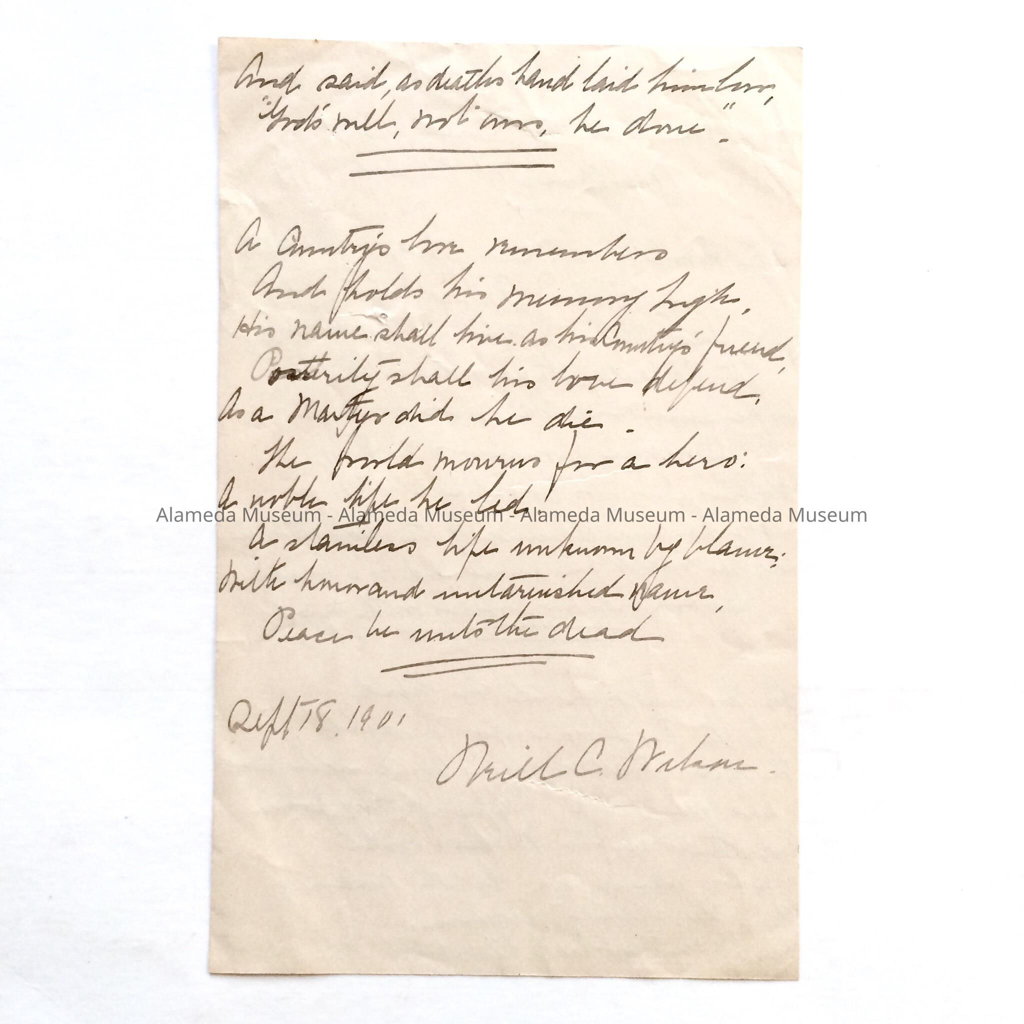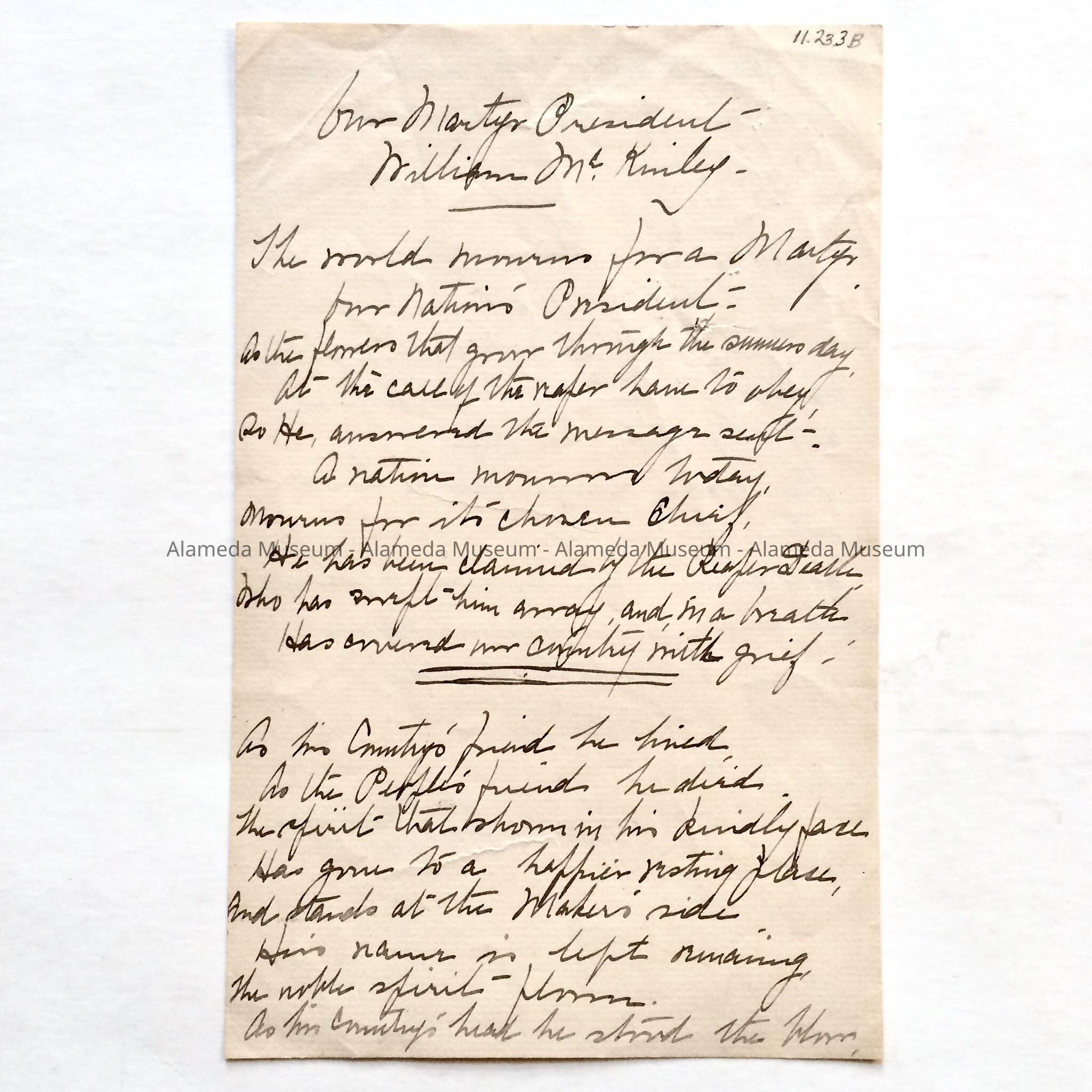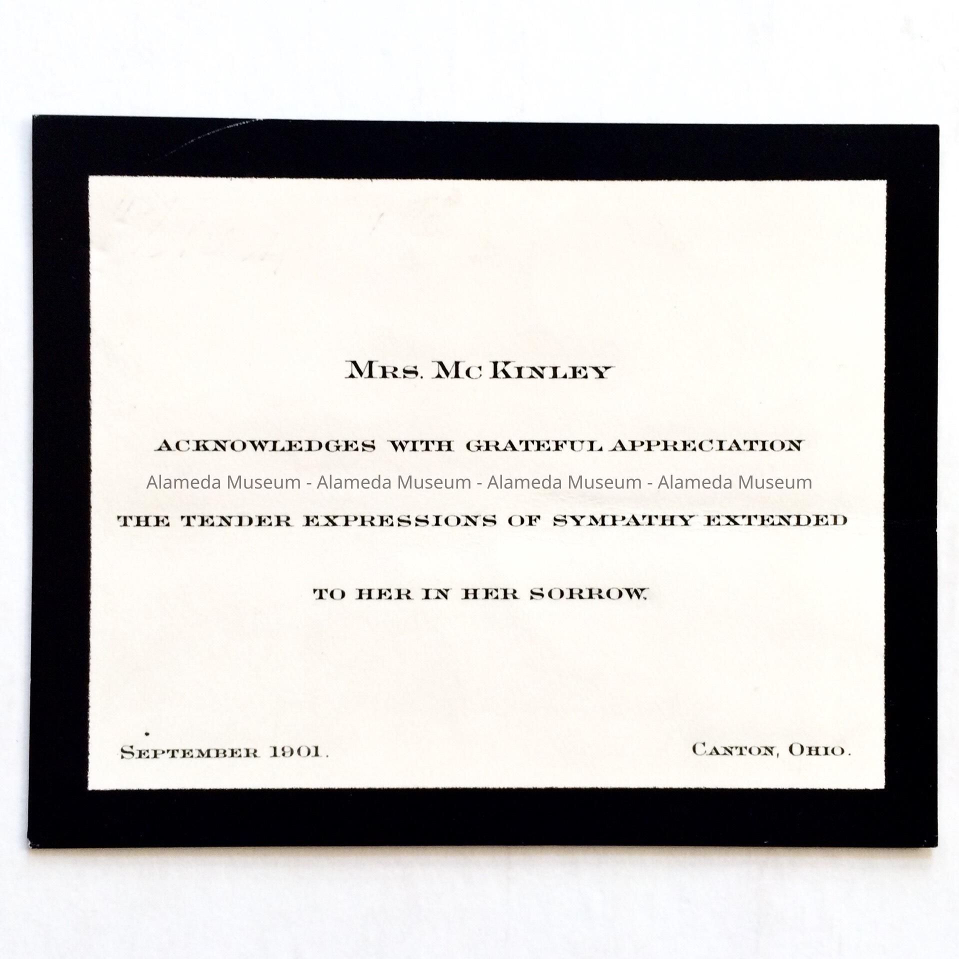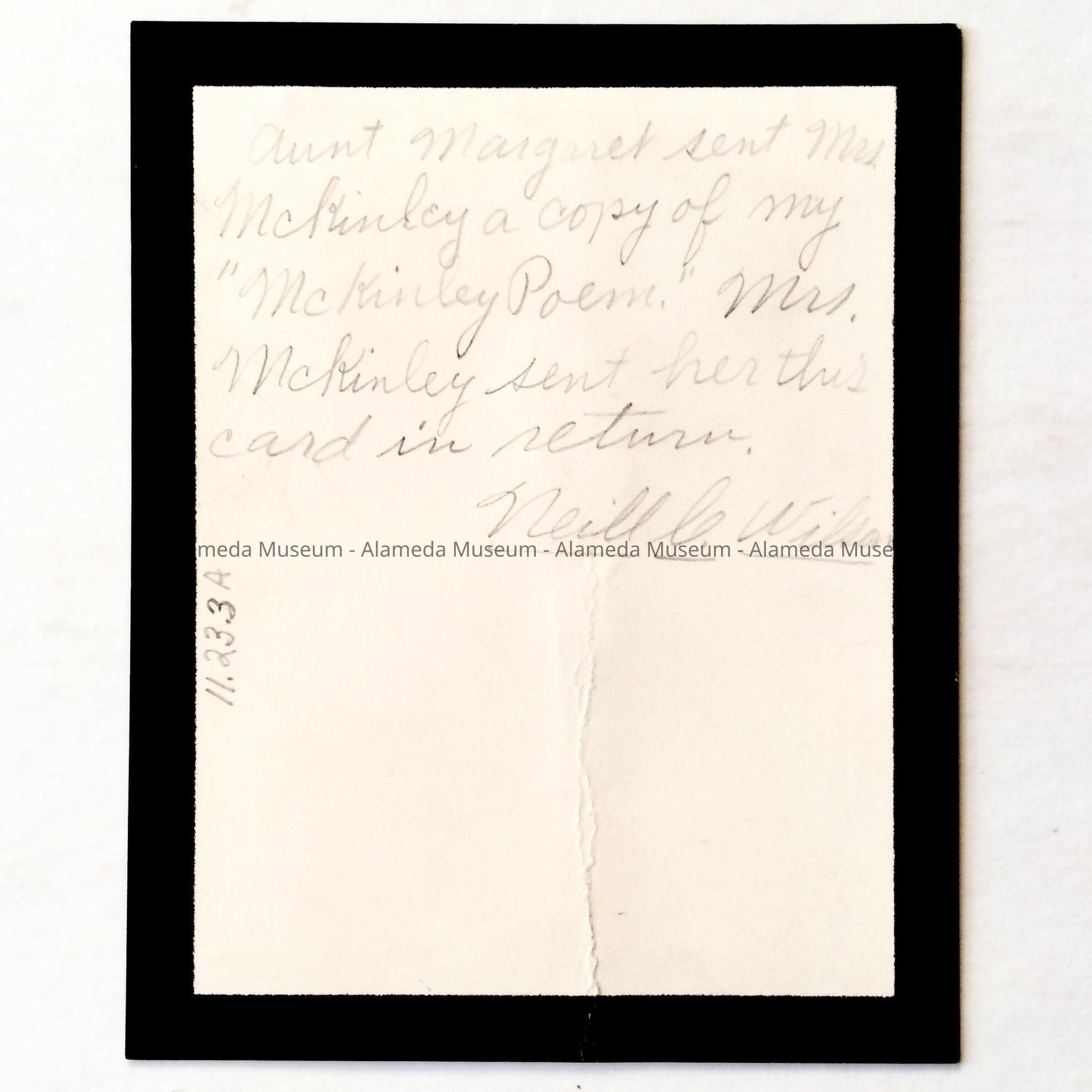 (A) Acknowledgement card from the bereaved Mrs. William McKinley dated September, 1901, sent to student Neill Wilson of Alameda, in gratitude for his expression of sympathy. A hand-written note on the verso states: "Aunt Margaret sent Mrs. McKinley a copy of my 'McKinley poem'; Mrs. McKinley sent her this card in return. Neill C. Wilson.".