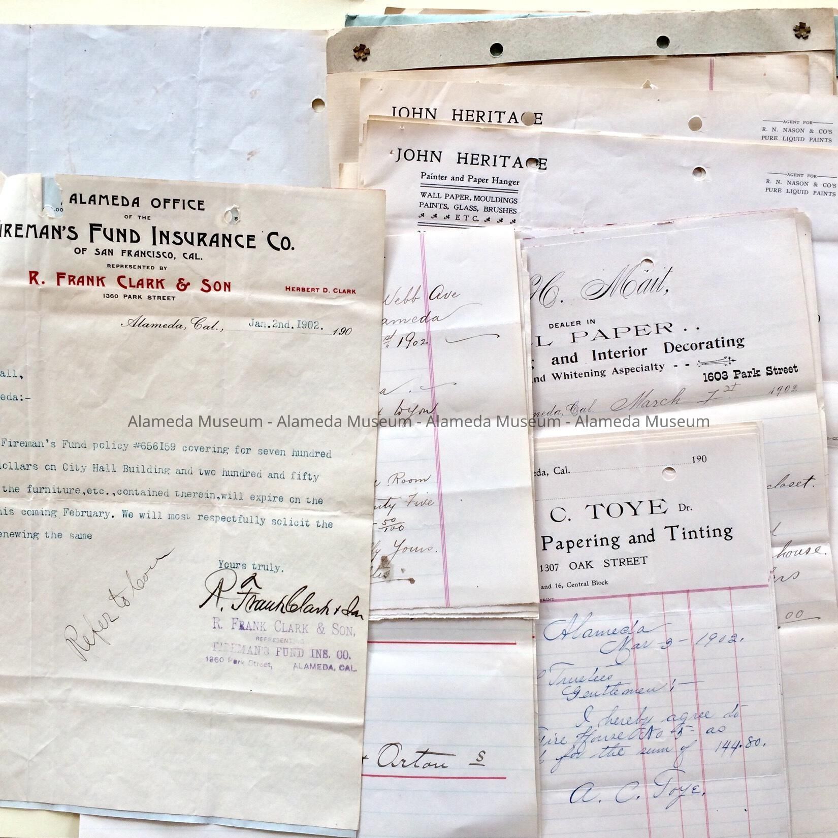Documents in this folder pertain to: #1: petition to connect bulkheads at foot of Bay Street, properties of Mrs. Baum and Mr. Meinecke; #2: offers to serve as insurance agent, by W.B. Storey, Geo Tyson, H.J. Chipman, R. Frank Clark & Son at 1360 Park Str. and Walter W. Goggin, Park Row; #3-6, 11 & 43: bids to paint the Fire Houses or Engine, by A.C. Toye, 1307 Oak Street, E. Shultis, 2415 Webb Ave, Sheele & Orton, 2322 Santa Clara Ave, J. H. Mait, 1603 Park Street, John Heritage, 2316 Alameda Ave, E. Young, 2408 Webb Ave, P. Christensen, James Tait, 1322 Park St., W.S. Risley, and W.P. Dillon, 1214 Paru St.; #3: A.L. Fish, S.F., exchange of a pipe for the Electric Light Plant; #4 resignation of David Rulfors as special Police officer; #5: complaint report by Police Chief John Conrad about intoxication and disturbing the peace by officer Charles Johnson. #8: expense overview Election School Board Dec. 7. 1901; #10: Report Municipal Electric Light Plant, November 1901; #12: Expense overview Fire Department Dec. 1901, by Chief Fred F. Kraith Jr.; #13: petition and resolution to add unincorporated uninhabited land to the City of Alameda; #14: Board of Education agreement to buy property of G. Zeh, SE corner of Walnut and Central to construct a High School; #14 1/2 Treaurer's Quaterly Report; #15 Semi-annual Fire Dept. Report, Januar 1902; #16: Standard Oil offers to supply fuel; #17, Ohmen Engine works bill for an 'engine'; #18 & #44: Report of Annual Electric Plant Boiler inspections, A. M. Locke inspector, of Hartford Steam Boiler Inspection and Insurance Co.; #19: Clerk Gillogly's Quarterly statement, Oct-Dec. 1901; #20: complaint of assault and cursing against Police officer Keyes; #21: report to Board President J.F. Forderer by A. Kynock, W.F. Shchulte, G.M. Sutherland, an H.N. Delanoy of examination of pipes laid on Mulberry Street by Powell Bros.; #22: Selling of bonds; #23, application for gratuitous license by Mr. Valentine of Oakland selling Valentines Electric Insect Destroyer; #24: Expense Report Fire Dept. for January 1902; #25: Report by Superintendent of Streets re sewer on Mulberry and Eagle Ave.; #26: Specifications for interior painting Fire Houses; #27: petition for an Arc Light in Railroad Ave between Oak and Walnut; #28: request for a light on Railroad Ave and Stanton; #29: petition to restrict keeping of cows; #31: Contra Costa Water Co. Report; #33: Woolner Oil company offering to supply fuel; #34: application by W.A.M. Dunbar from Oakland for gratuitous license to sell his magic lotion, ointment & medicines; #35: Union of Carpenters & Joiners, requesting control of quality of concrete foundations; #35 1/2: petition for Street light on Morton Street; #36: petition by J. Bonne, 1615 Webster St., to move a Laundry to 1616 Webster St.; #37: application for license to serve refreshments during a Bohemian Club Ball at Armory Hall; #39: complaint about sewer on Central Ave; #40: request to run a telegraph wire from 717 to 901 Paru & permission to use trees, signed by Alan Field of 717 Paru St.; Expense Report A.F.D. for February; #45: Inspection report of Supt. of Streets V.M. Frodden of the sewer at Central Ave; #46: Request for information by County Auditor Hall of Records; #47: Financial Report by Oakland Transit, successor to Alameda, Oakland, and Piedmont Electric Railway; #48: Petition by B. R. Jocus to move a cottage from 2850 Central Ave to college Ave.#49: petition for lights corner St. Charles & Santa Clara Ave.; #50: application for gratuitous license to peddle milk in a wagon by Julia Trothingham, Alameda & by A.F. Hoogs, Oakland, to distribute circulars and bills.