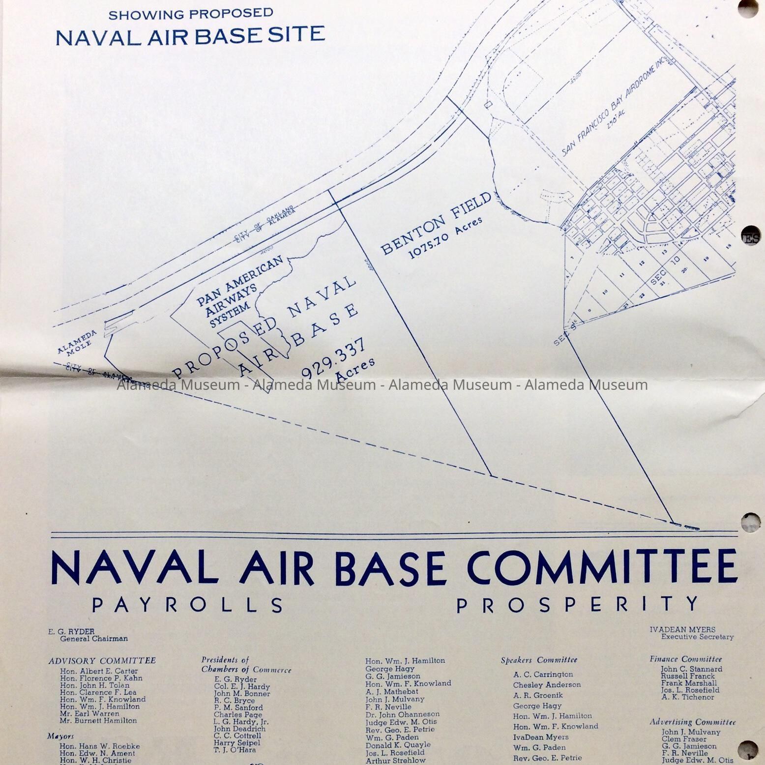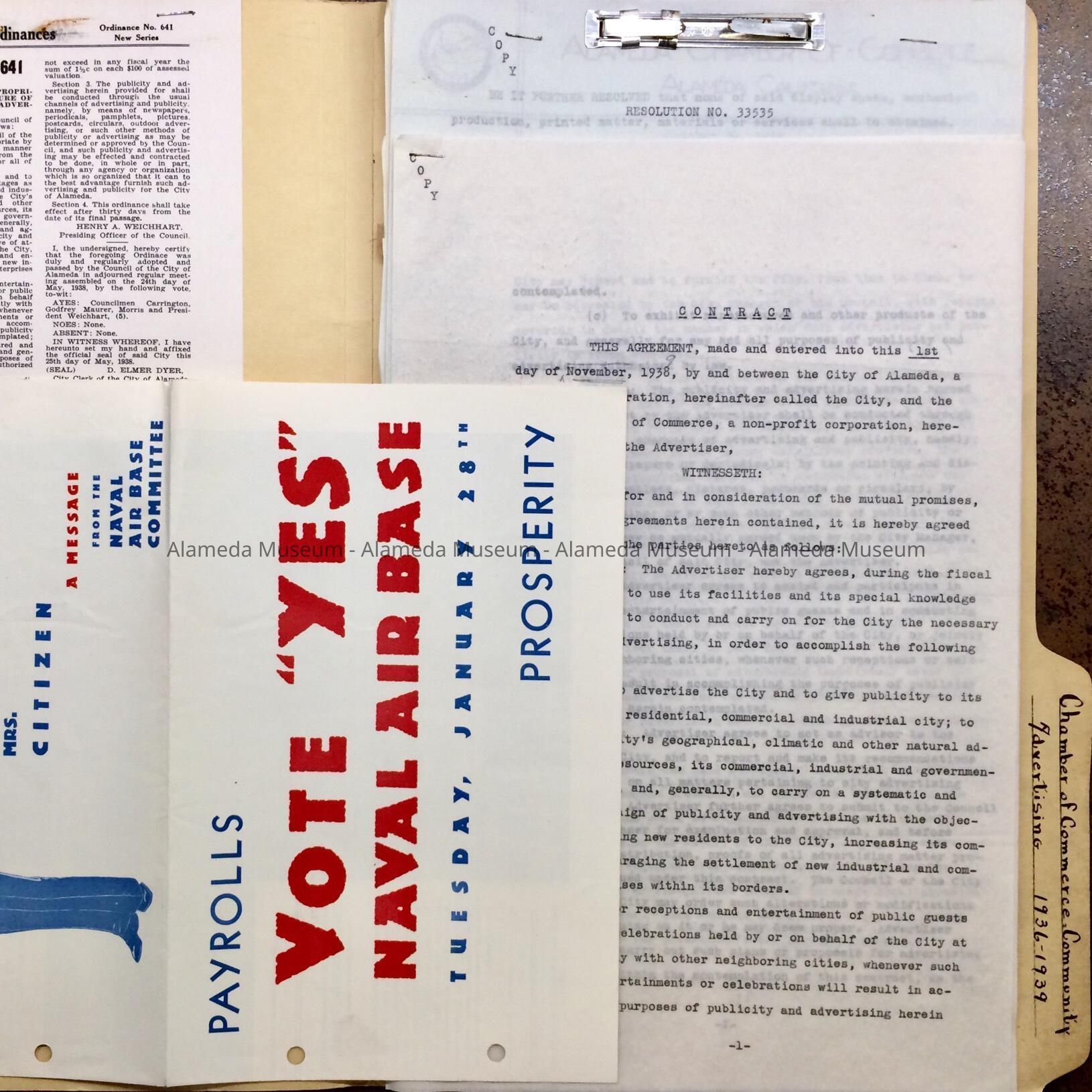 History of Object: Ordinance No. 641 and correspondence regarding cost incurred by the Chamber of Commerce for advertising on behalf of the city. Includes 1936 flyer in support of establishment of a Naval Air Base, with a map which includes the San Francisco Airdrome, Benton Field, the proposed Naval Base Site, and the location of the Alameda Mole.