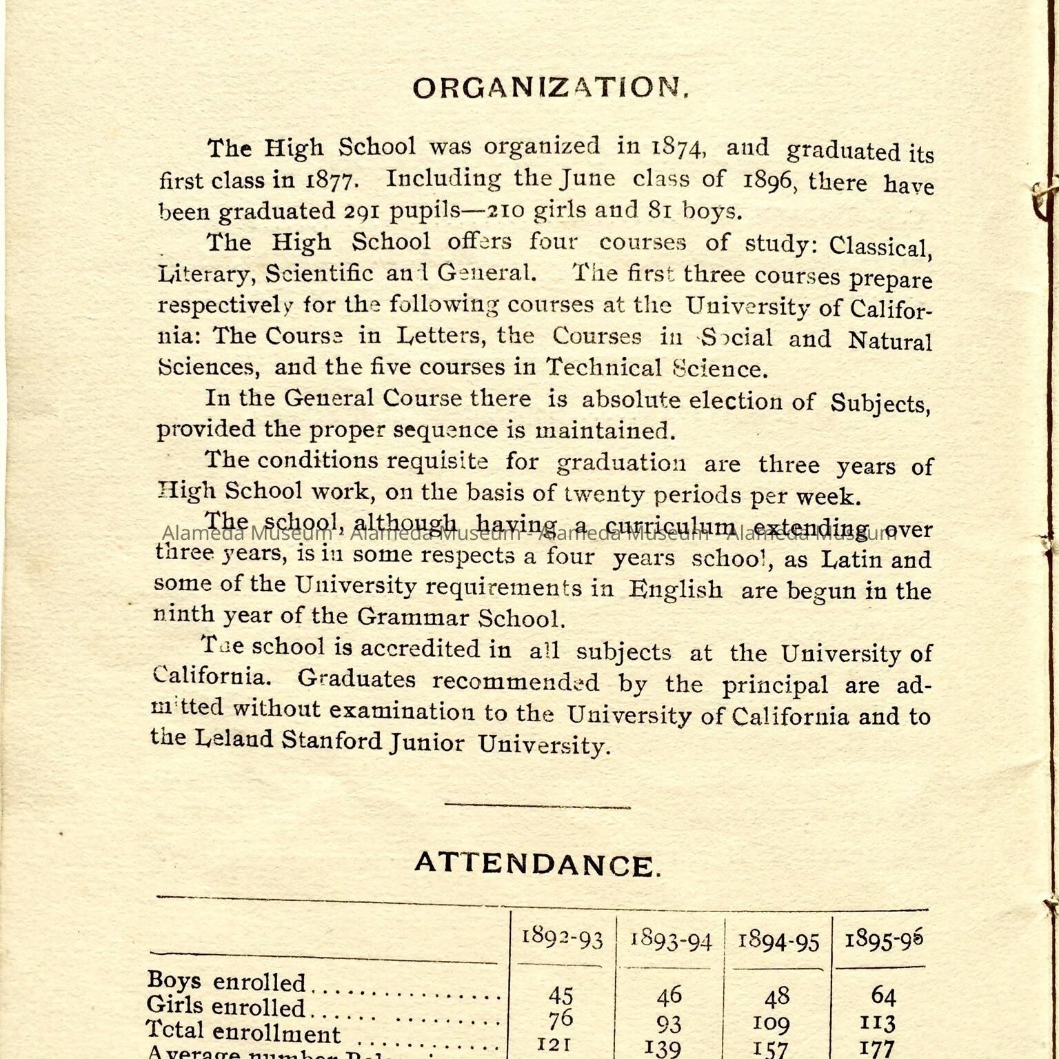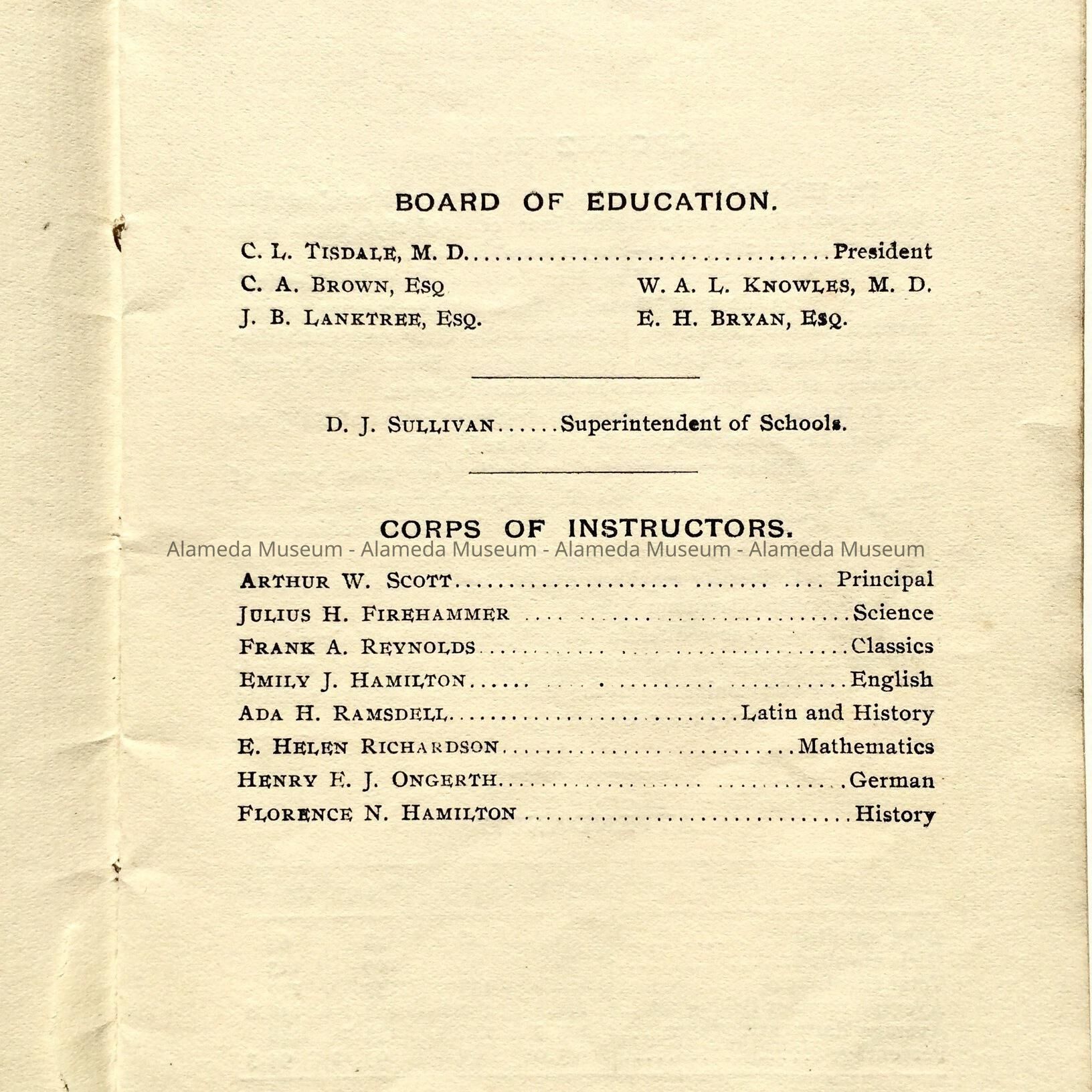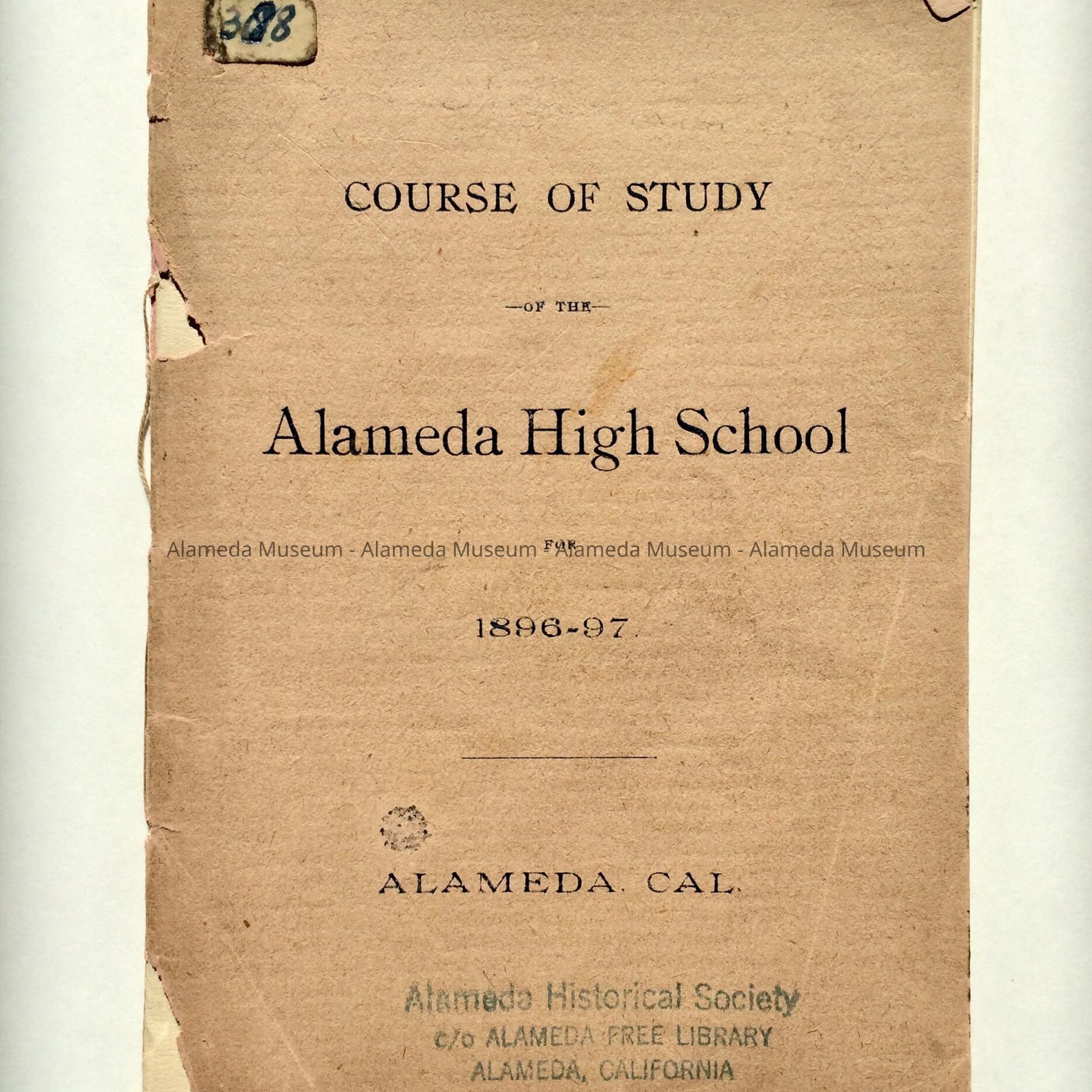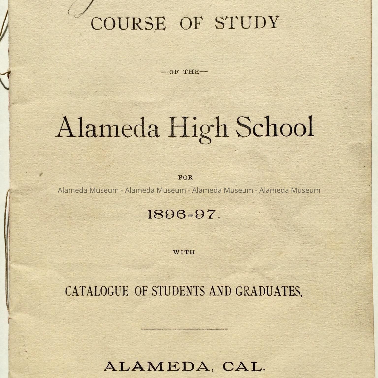 Booklet containing course of study of Alameda High School for 1896-97. Booklet also contains the names of the then Board of Education and the names of the instructors of the high school. Also included is a list of graduates from 1896-1897.