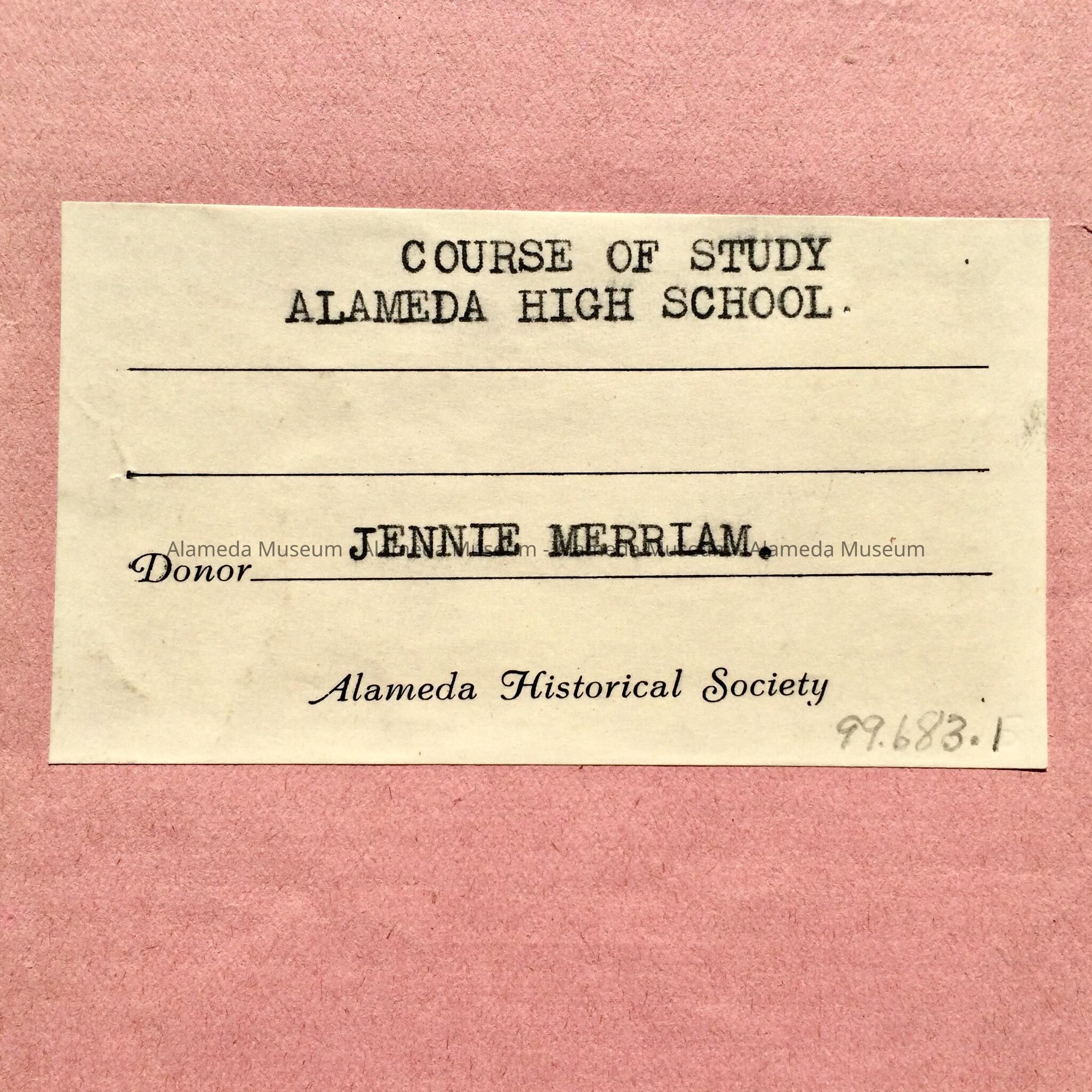 Softbound booklet. Cover has bold-printed caption, “Alameda High School” in blue colored type on a pink-colored background.