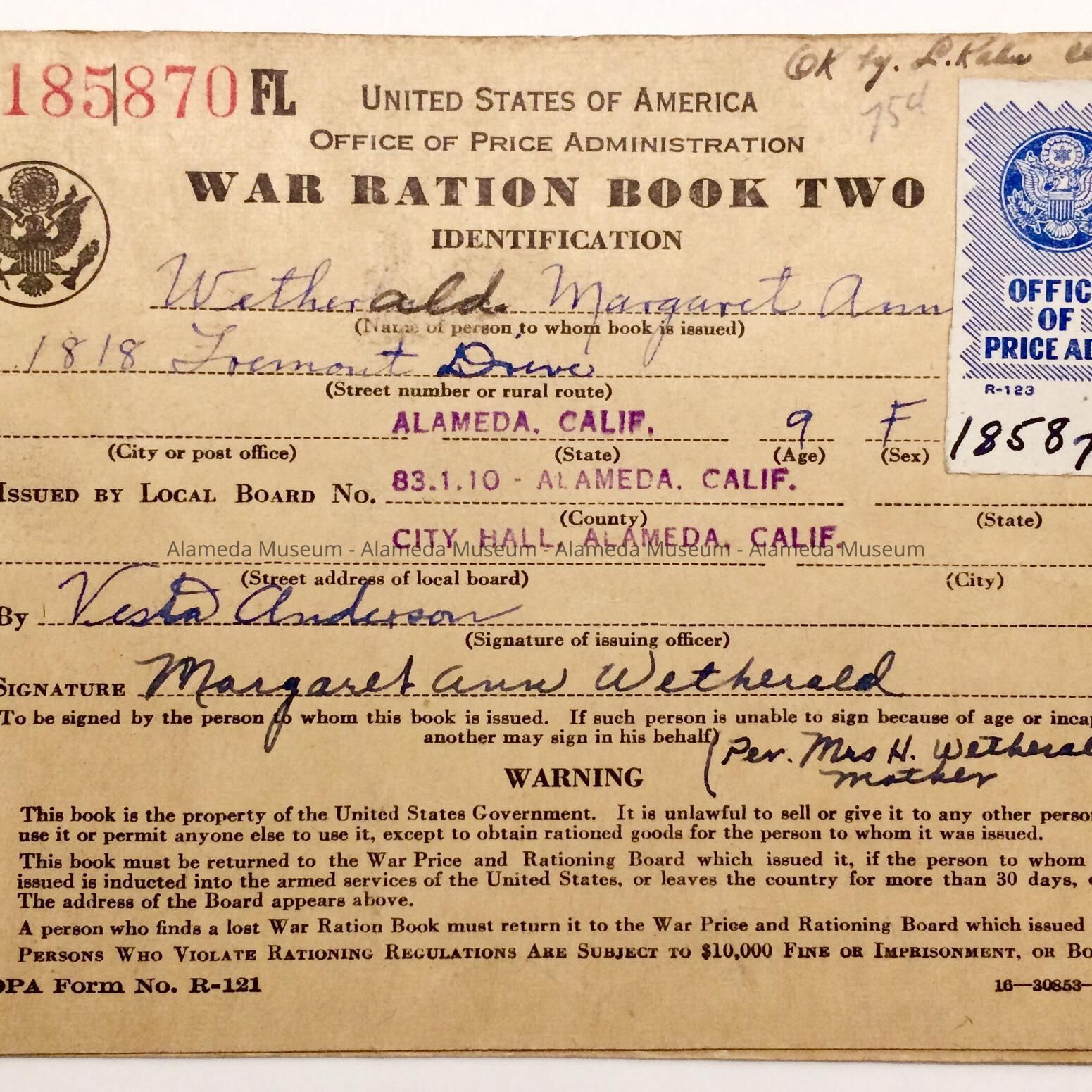 History: Coverlet to U.S. Office of Price Administration Ration Stamps issued by Vesta Anderson of the local board, No. 83.1.10, City Hall, to Margaret Wetherald of 1818 Fremont Drive, during World War II.