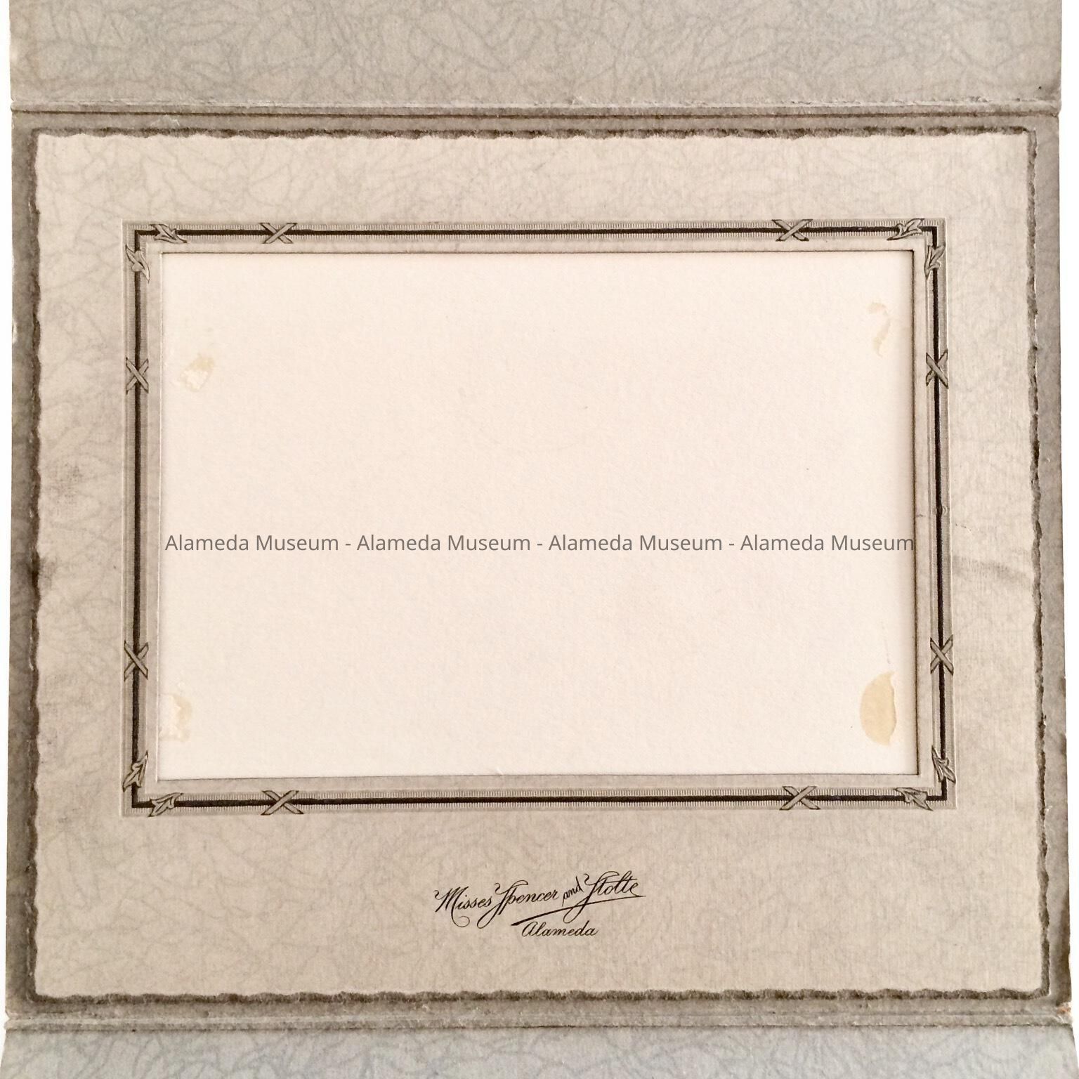 DESCRIPTION: GREY-COLORED TAG BOARD COVERLET THAT OPENS, REVEALING SECTION FOR PLACEMENT OF PHOTOGRAPHS. BELOW THE PHOTO MAT IS A BOLD-PRINTED CAPTION, "MISSES SPENCER AND STOLTE, ALAMEDA.”