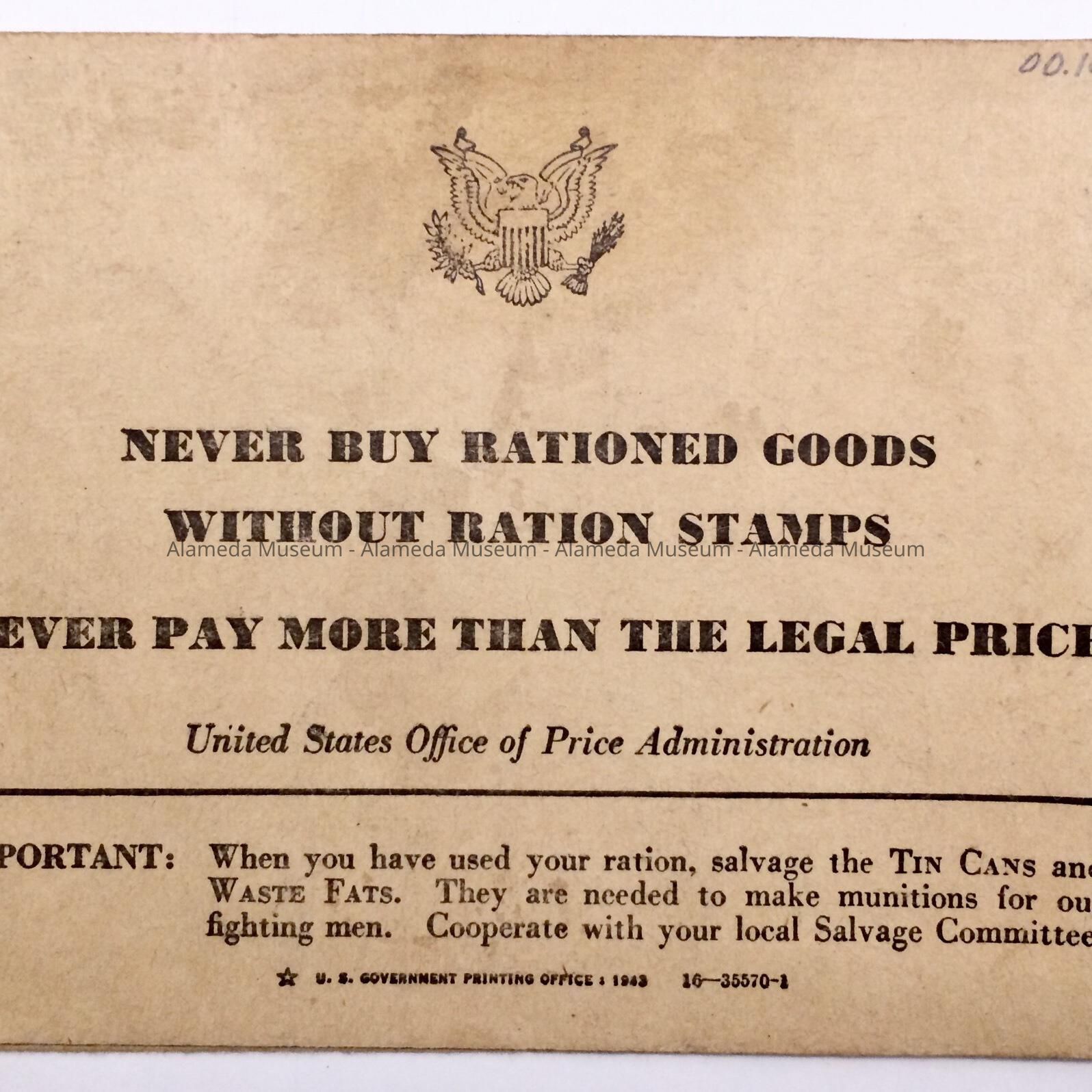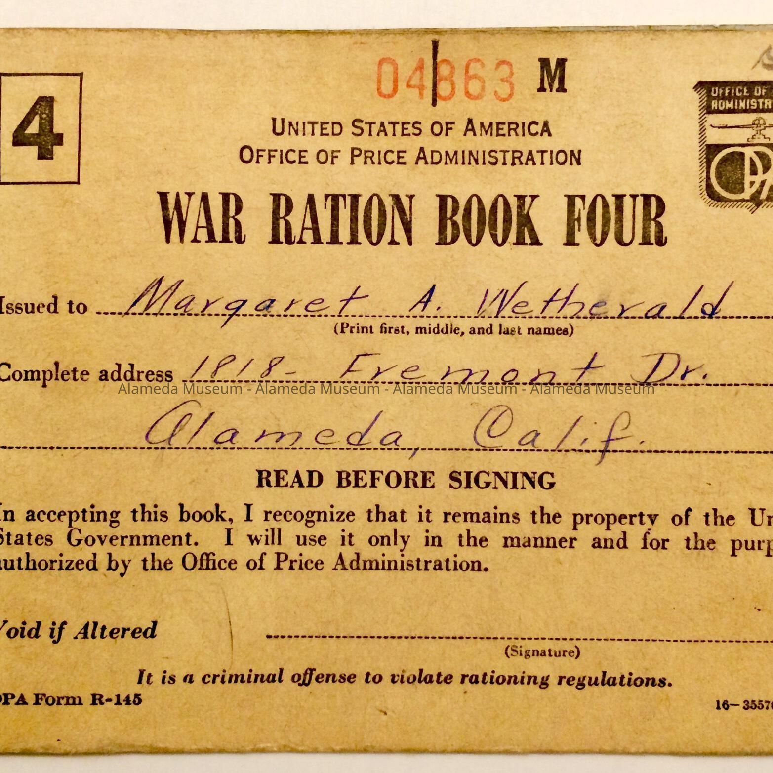 History: War Ration Book issued to Margaret A. Wetherald who resided at 1818 Fremont Drive.