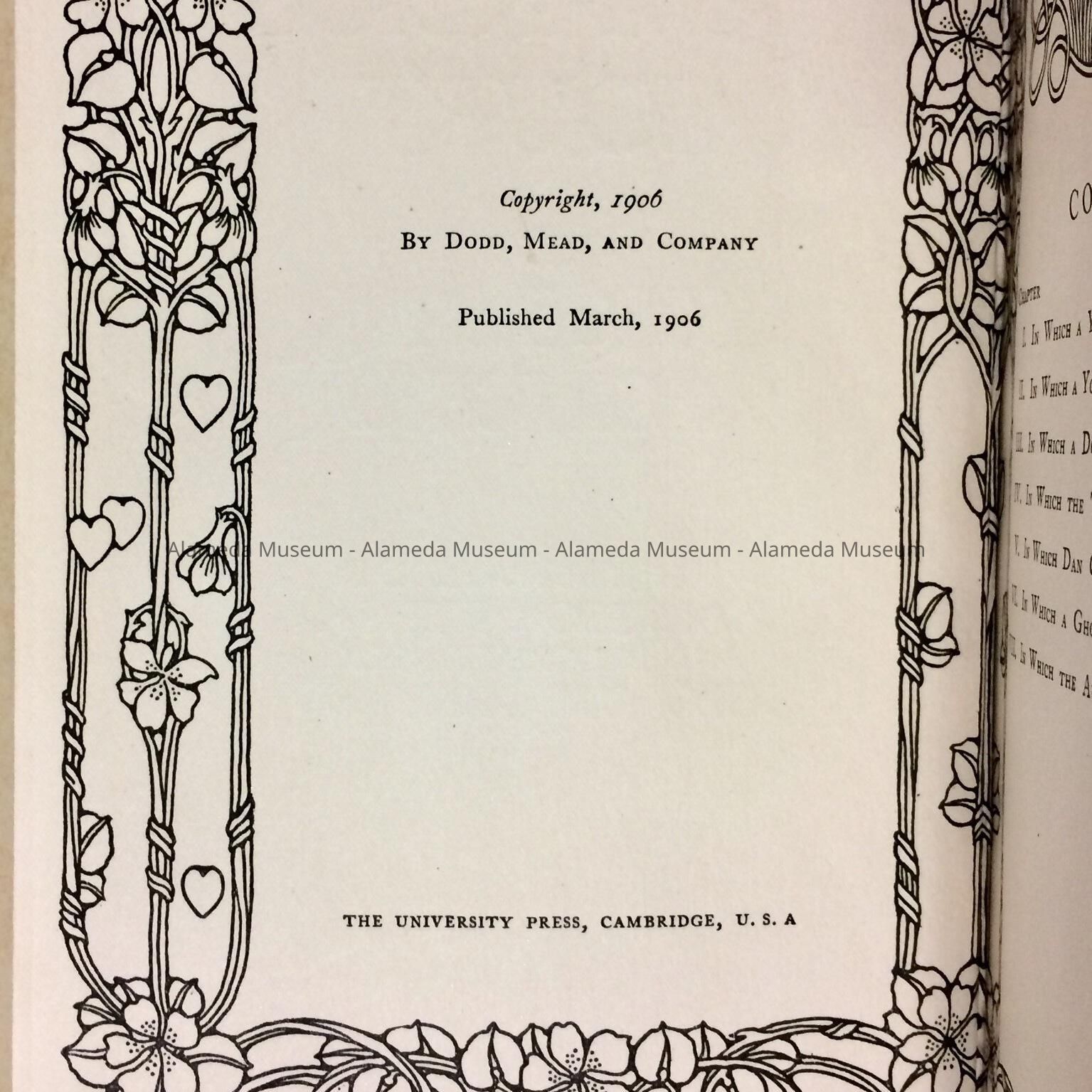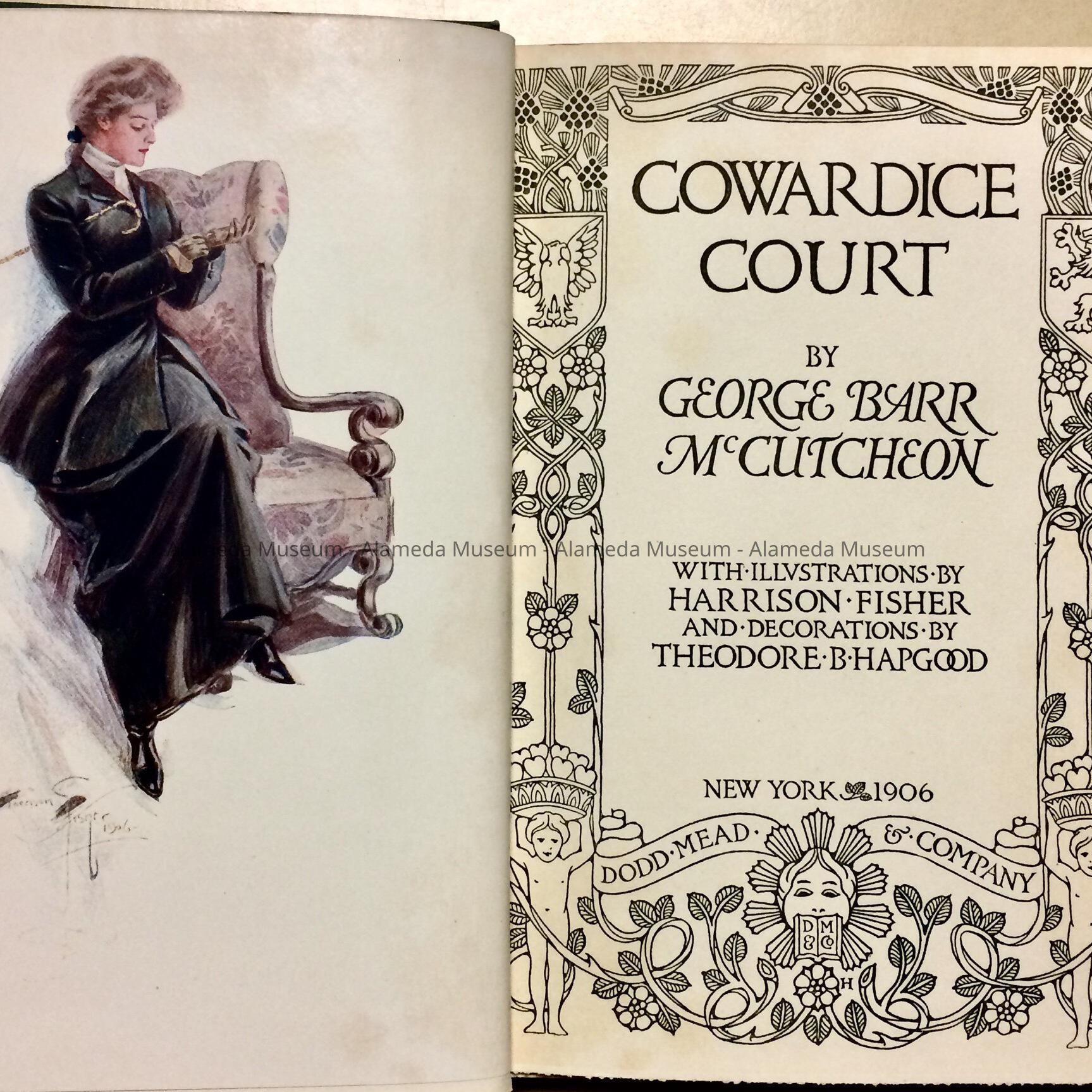 History of Object: Book entitled "Cowardice Court" by George Barr McCutcheon and illustrated by the noted artist Harrison Fisher. Fisher was born in NY and was brought to Alameda as a child and attended local schools. His father, Hugh Antone Fisher was also a noted artist and died in Alameda. Harrison returned to NY where he became a prominent illustrator of the period.