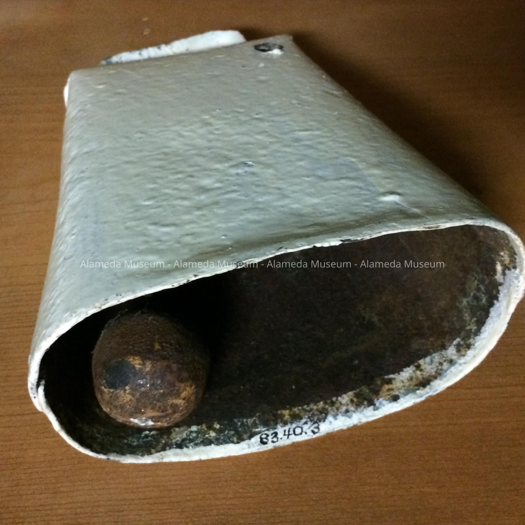 Bell used on the cow owned by the Abram Rich family, early pioneers of the West End, Alameda, Ca. Rich erected his home at 1620 4th Street, circa 1868, on land purchased in 1866, from W. W. Chipman. The house is still standing (1983) and is occupied by the descendents of the original owner.