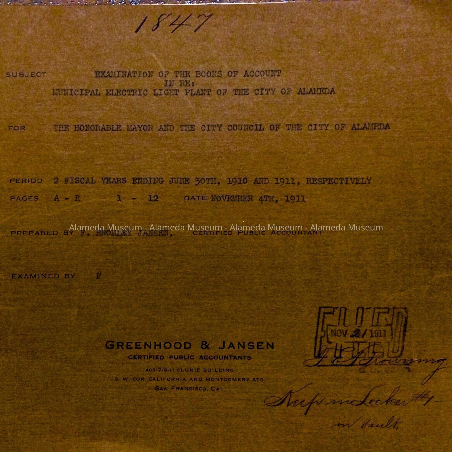 Report, with cover letter from the Finance Committee of the City Council of Alameda, titled ‘Examination of Municipal Electric Light Plant of the city of Alameda’, for Mayor and Council of Alameda, by Greenhood & Jansen, Certified Public Accountants, San Francisco, covering Fiscal years 1910 and 1911. Includes spreadsheets of expenditure, revenue, taxes, depreciation, etc. It is the 2nd oldest municipal power company in the USA.