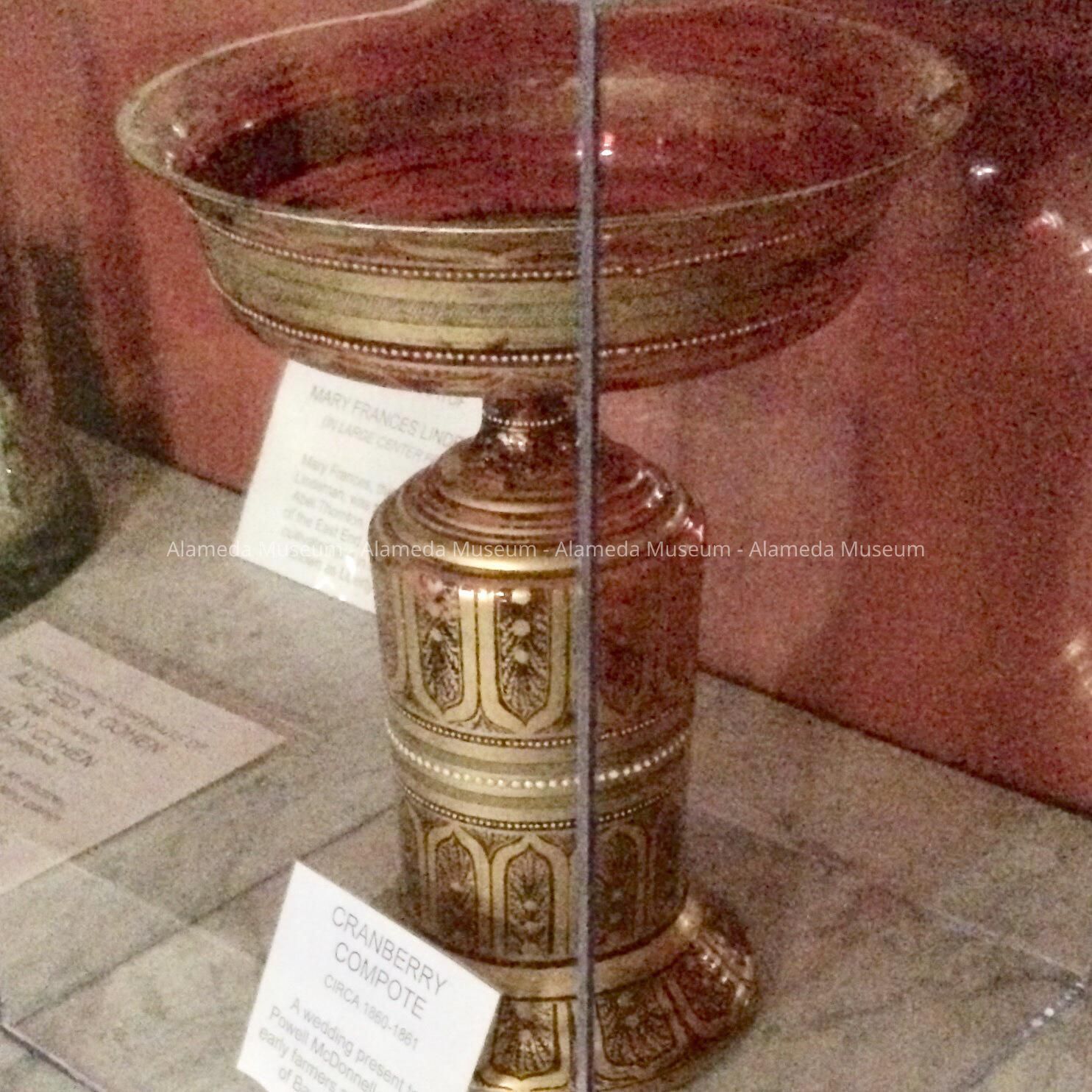 History of Object: Compote was a wedding present to Mr. & Mrs. P. A. McDonell, from Mr. & Mrs. Amos Mecartney, all pioneer names of Bay Farm Island, Alameda. At one time there was a road on the island named in honor of the McDonells. The McDonells settled there prior to 1872, owning several acres of land which they farmed.