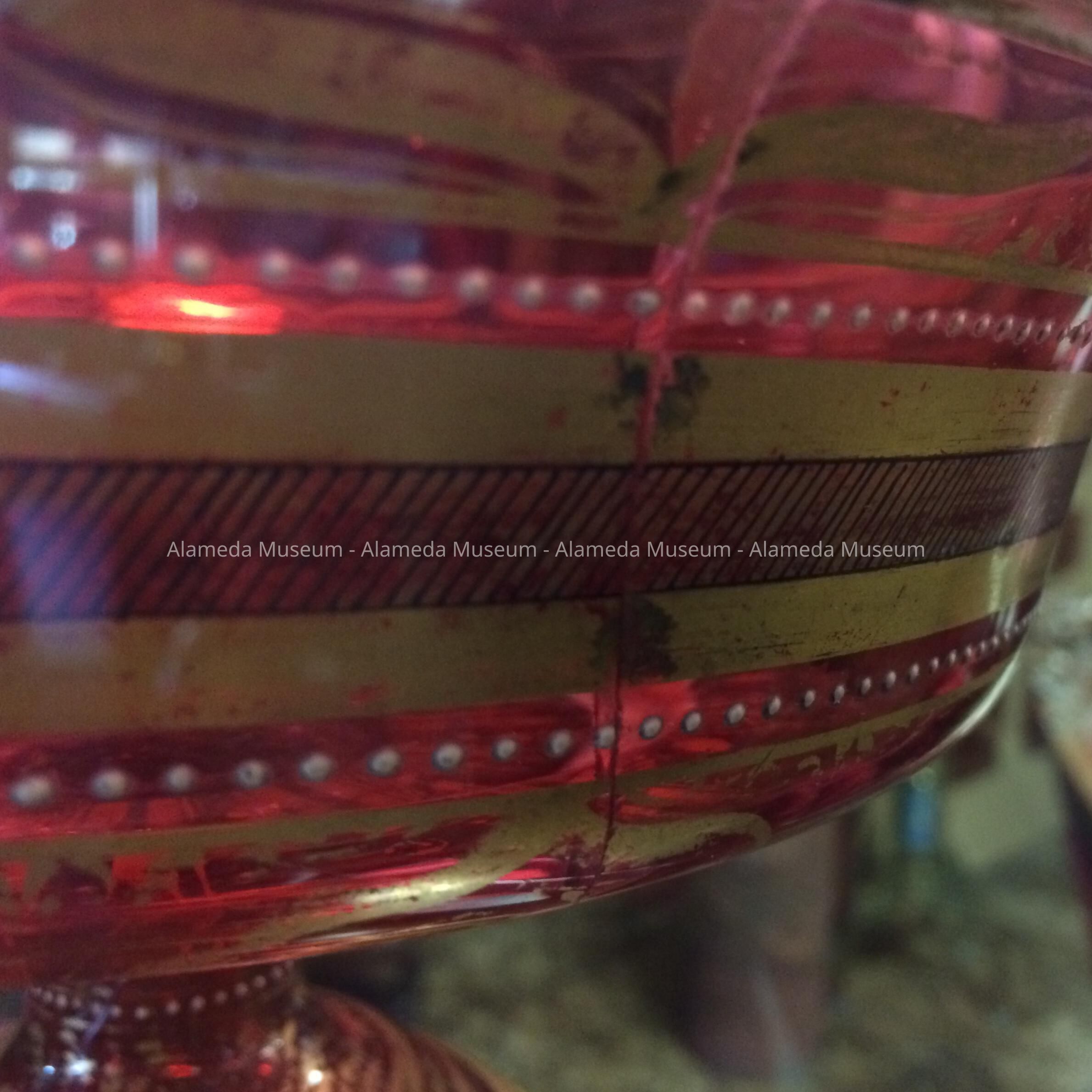 Description: Cranberry glass compote, heavily decorated with gold, massive hollow pedestal base with white enamel beading. Bowl of compote has been mended with red tinted tape.