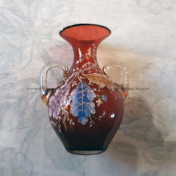 CRANBERRY-COLORED GLASS VASE, WITH APPLIED HANDLES IN CLEAR GLASS ACCENTUATED WITH GOLD. BODY OF VASE HAS ENAMEL WORK, WITH A DESIGN OF LEAVES, BRANCHES, ETC., IN BLUE, LAVENDER, AND ORANGE. VASE APPEARS TO BE OF EUROPEAN MANUFACTURE.