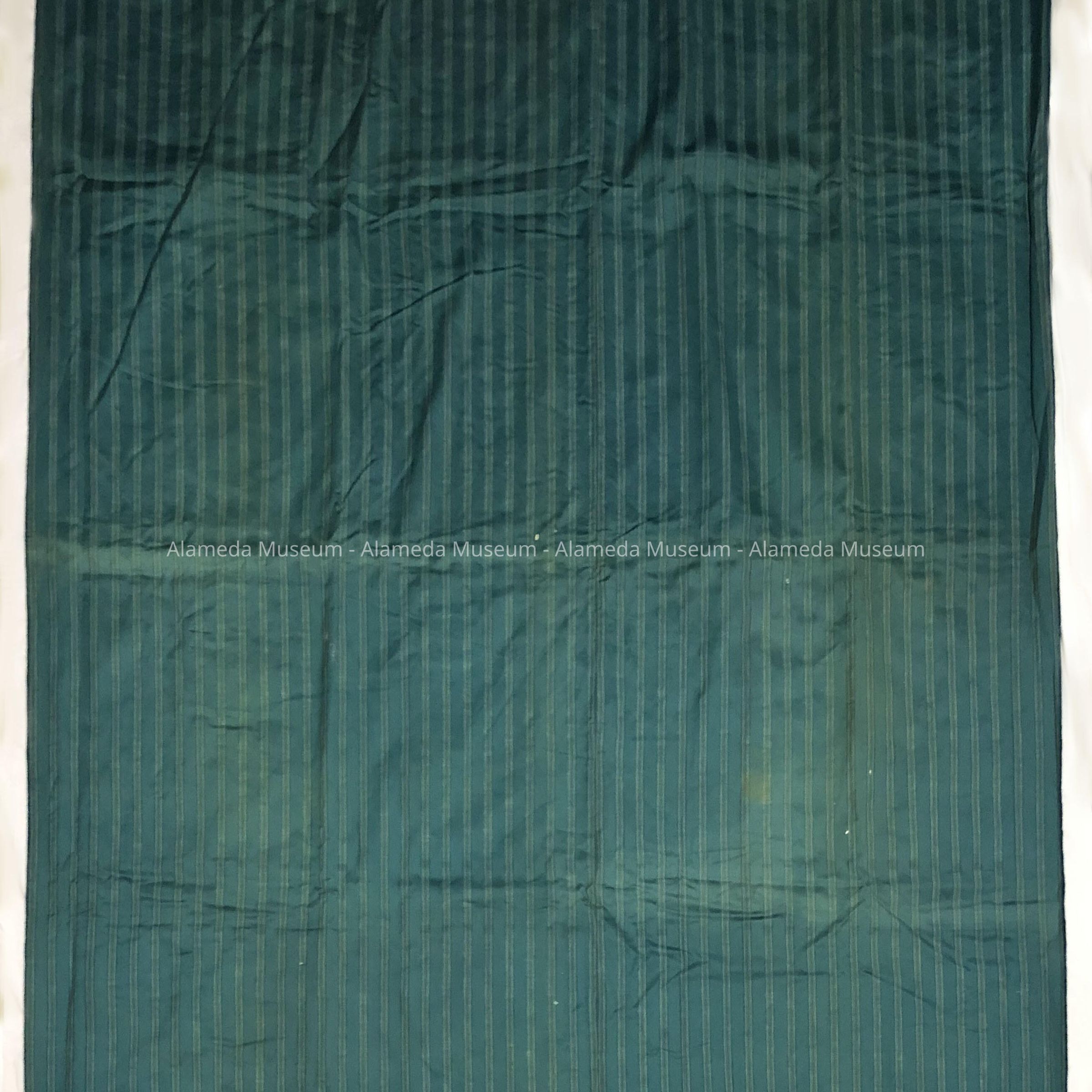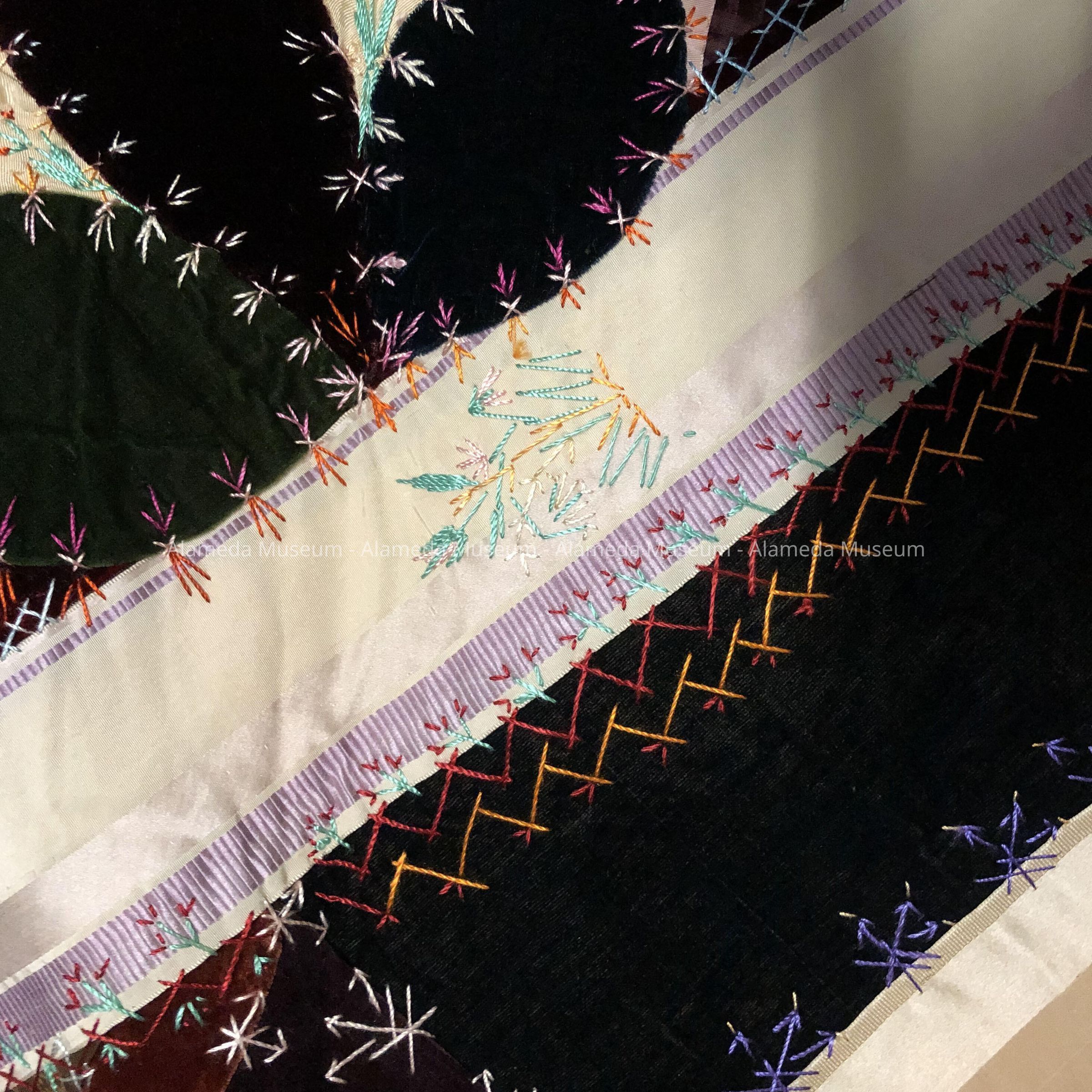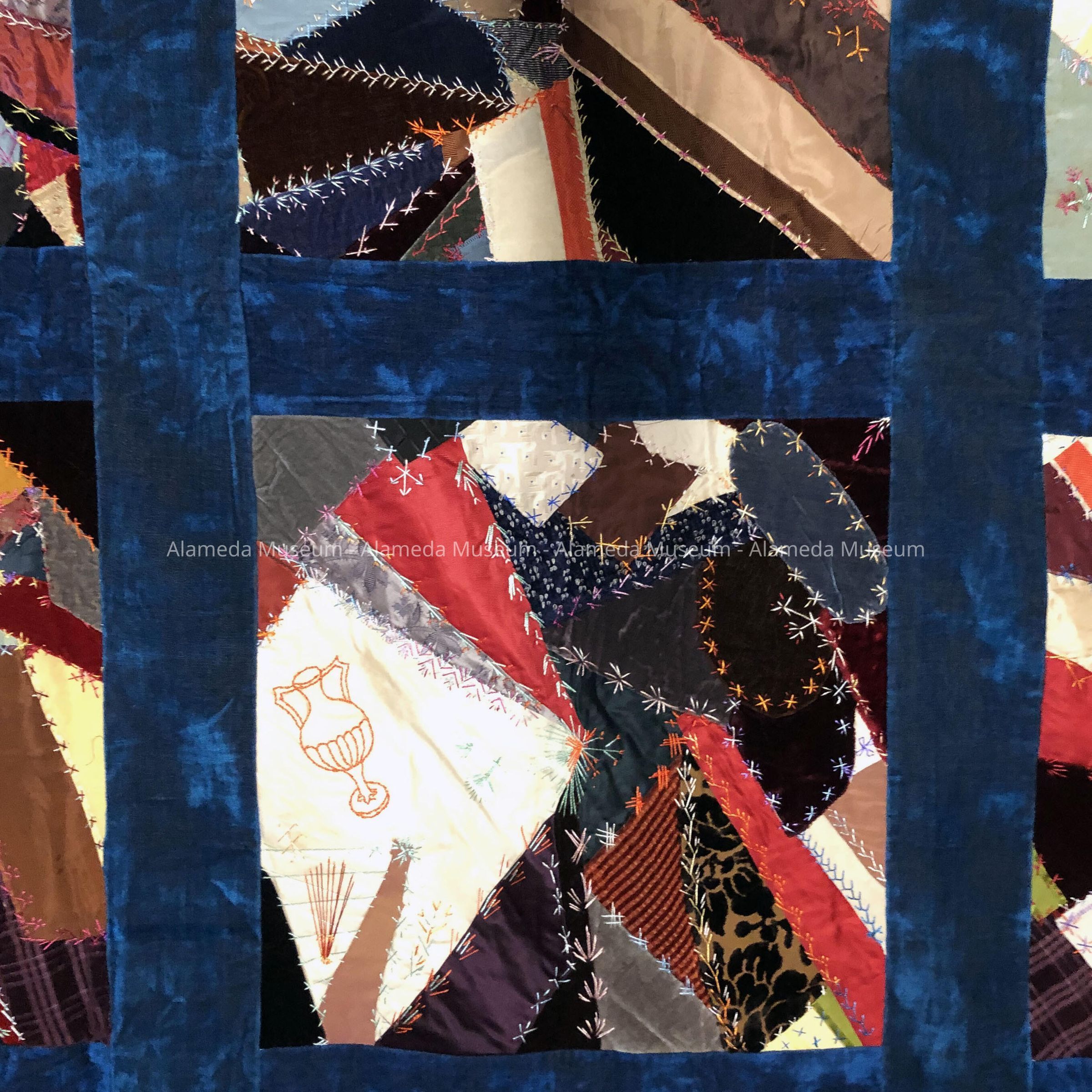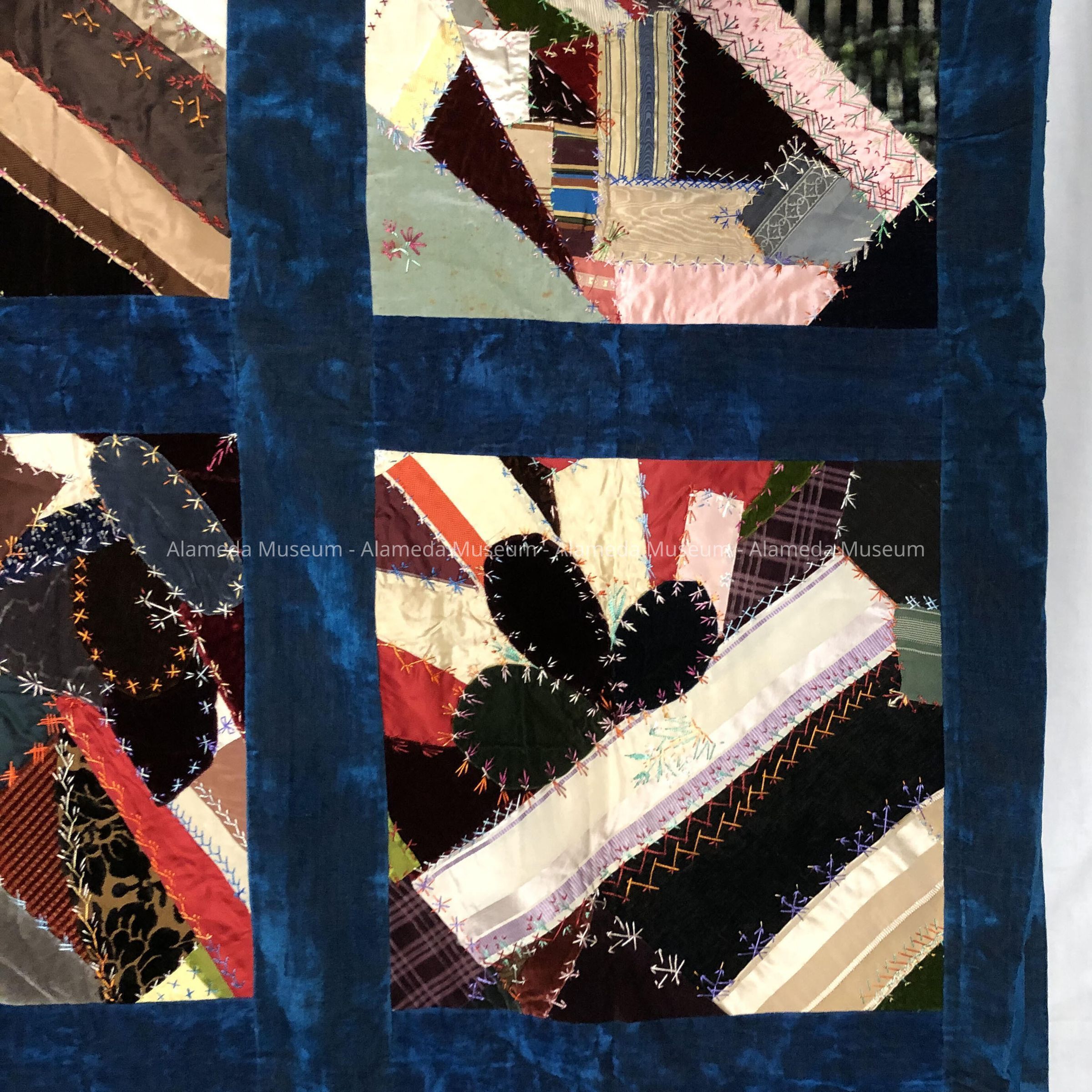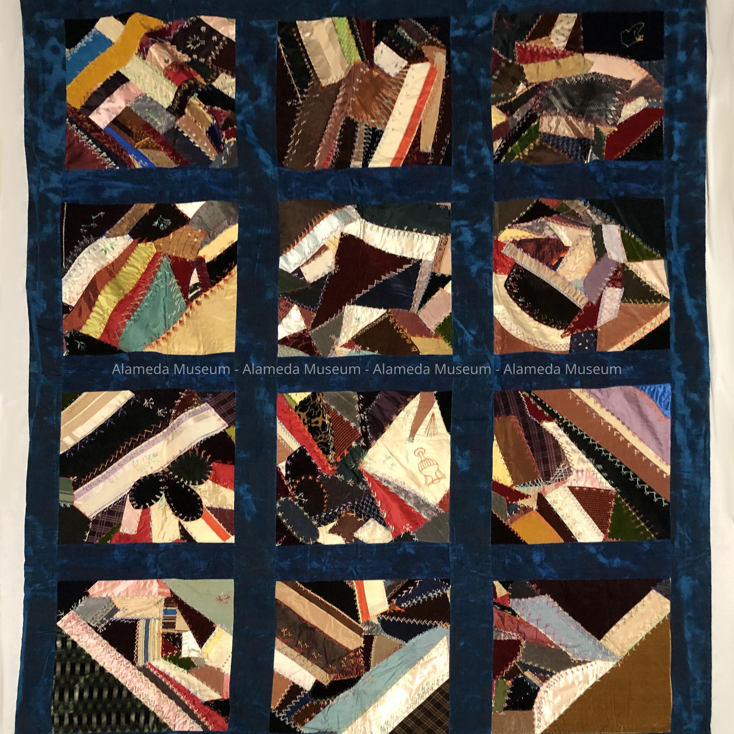 Description: Crazy quilt composed of silk, satin, and plush squares accentuated with multi-colored feather stitching. Individual quilt squares framed in dark blue plush. A few of the squares have embroidered designs i.e. vase, boot, etc. Quilt backing of striped two-toned blue cotton damask.