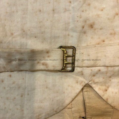 It has a watch fob pocket and two more pockets at waistline. Front is padded. Back is of cotton with buckle at waist. Back has rounded edge.