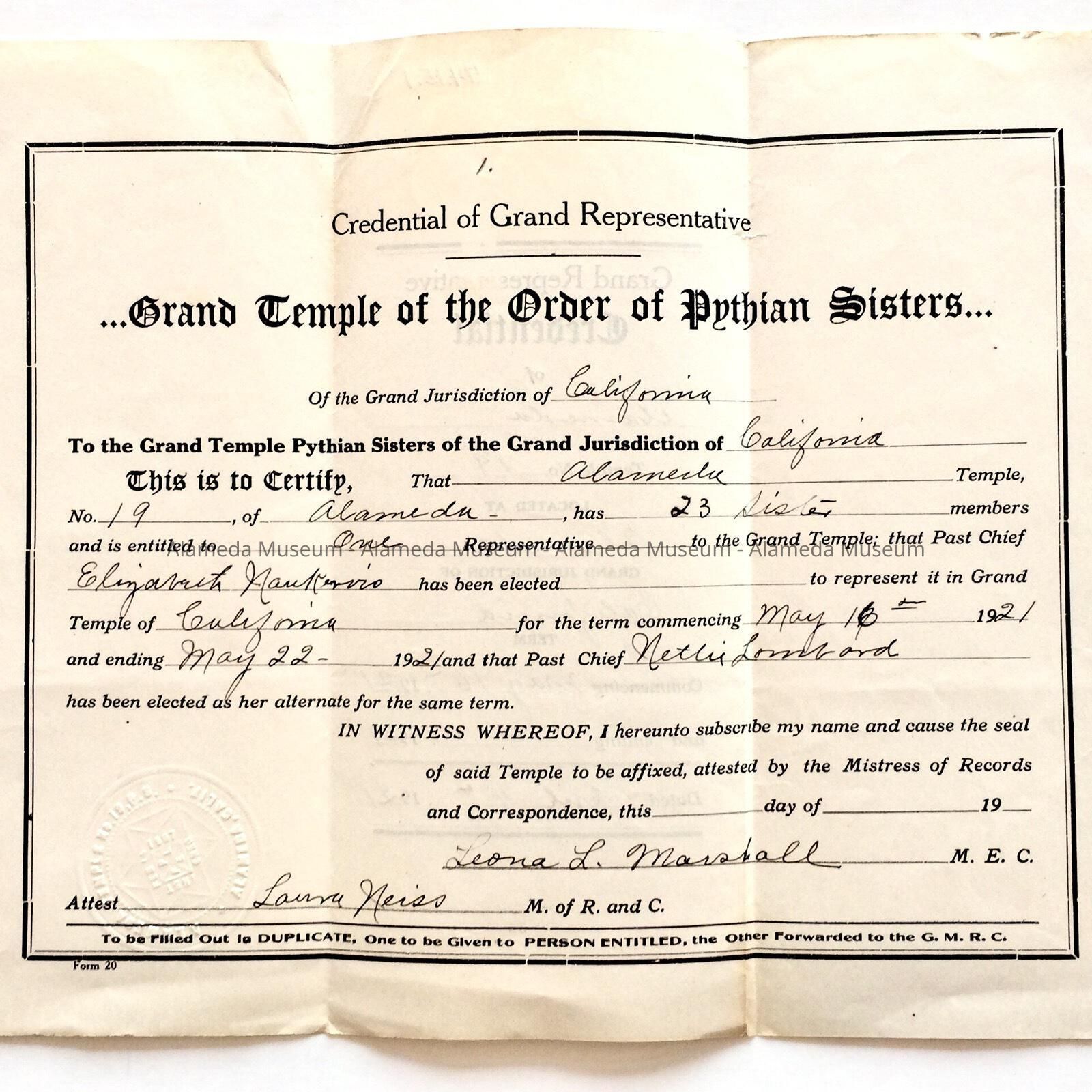 THE DOCUMENT STATES THAT SHE HAS BEEN ELECTED TO REPRESENT ALAMEDA AT THE GRAND TEMPLE OF CALIF, FOR THE TERM COMMENCING MAY 16, 1921. BOTTOM LEFT HAND CORNER HAS IMPRINT OF PYTHIAN SEAL. PARTIALLY HAND WRITTEN.