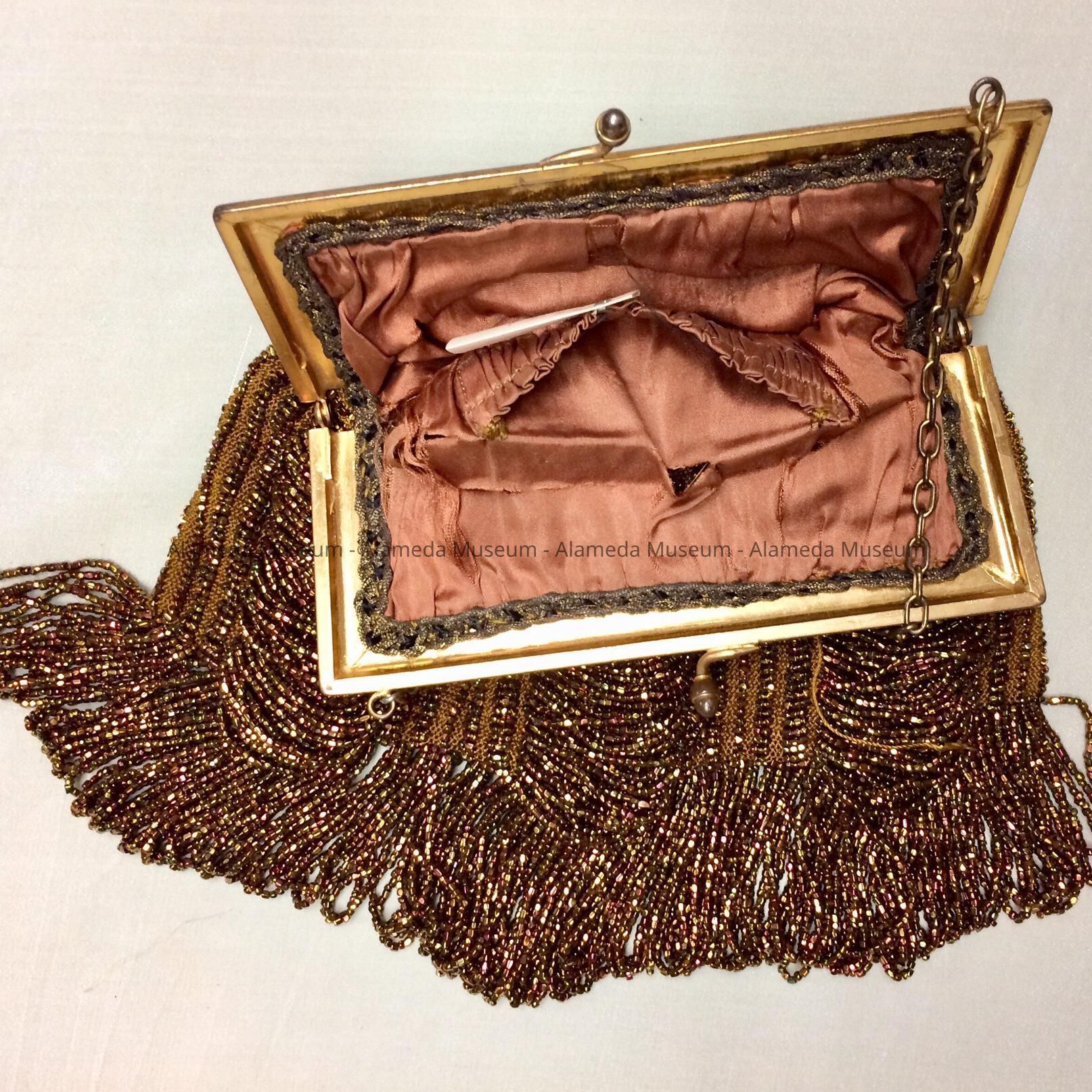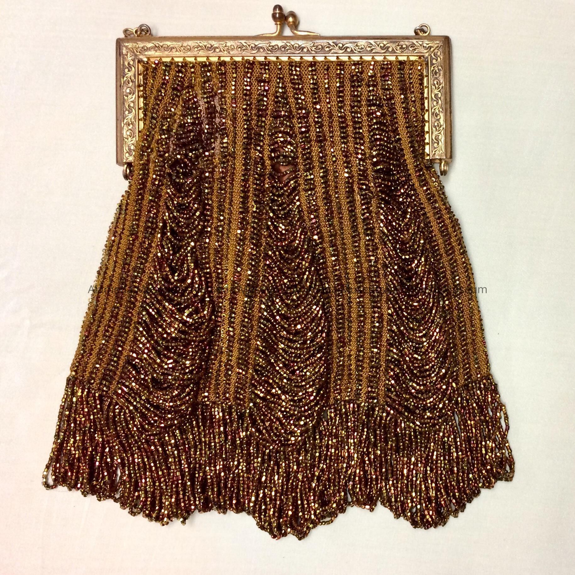 Description: Purse of iridescent brown colored beans attached to a crocheted background. Gold plated metal frame (& catch) with chain link handle. Interior lined with brown colored silk.