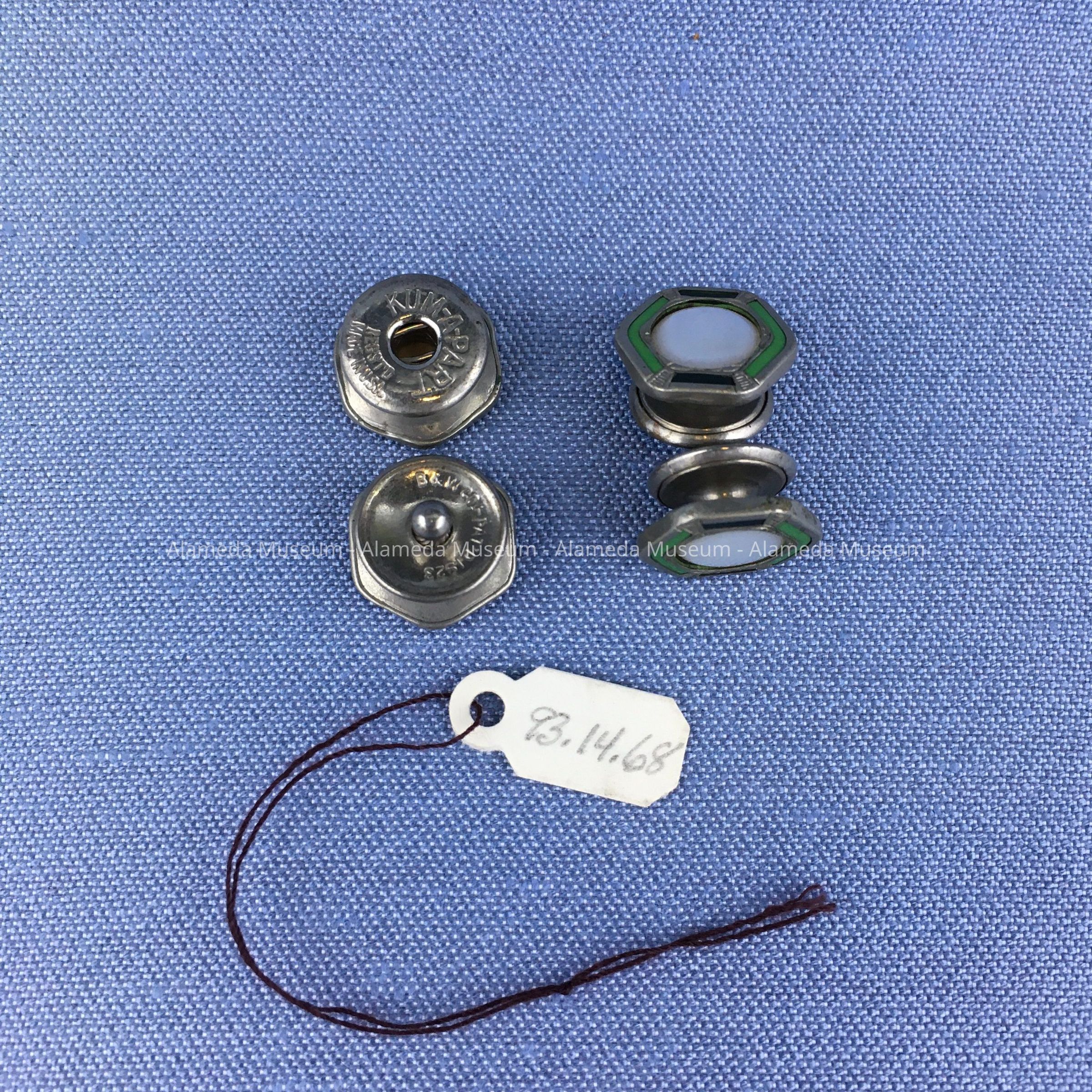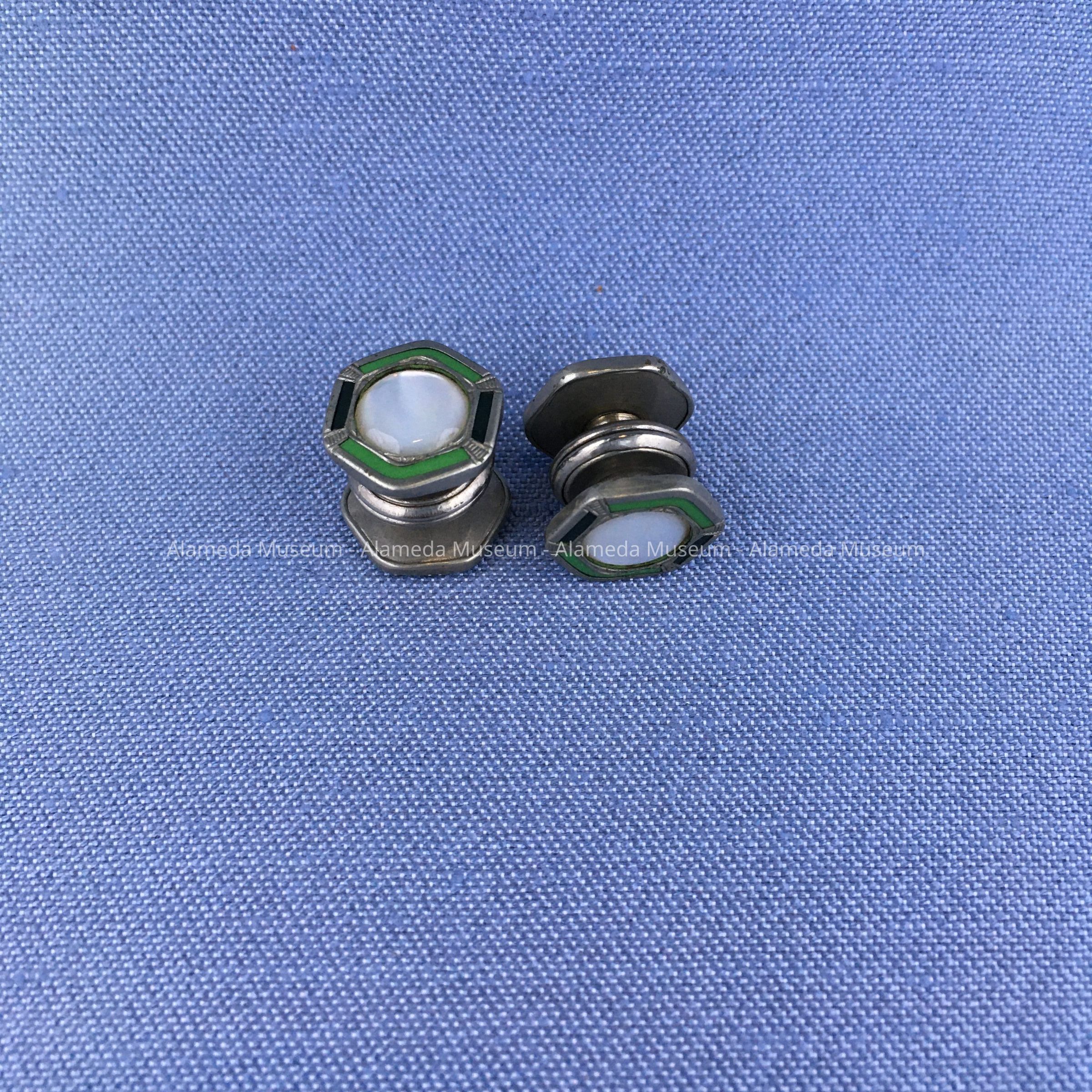 Cuffling-stud with mother-of-pearl button and green and black enameling, c, 1920sEntry/Object ID
