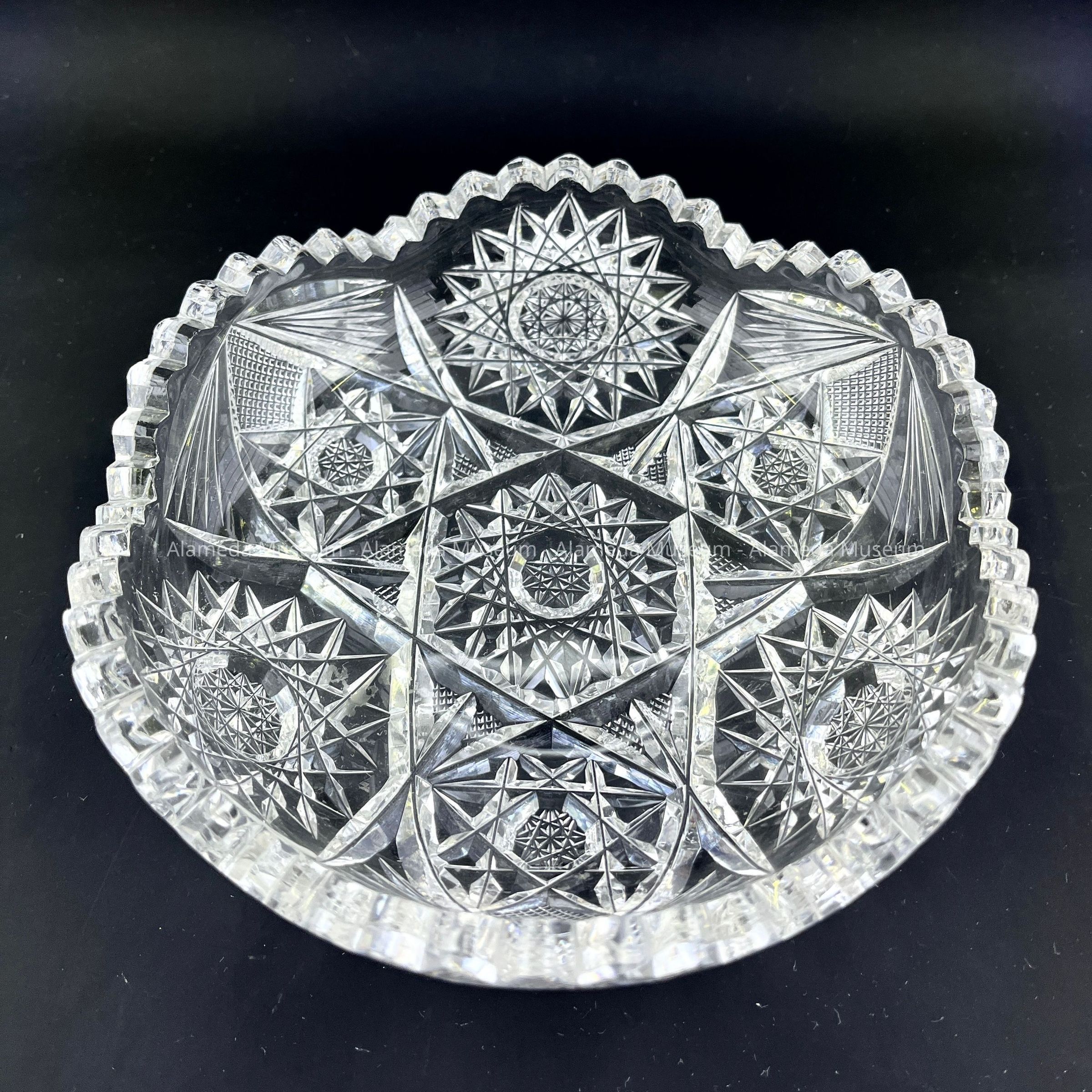 American cut crystal candy dish with pinwheel design and scalloped rim.
